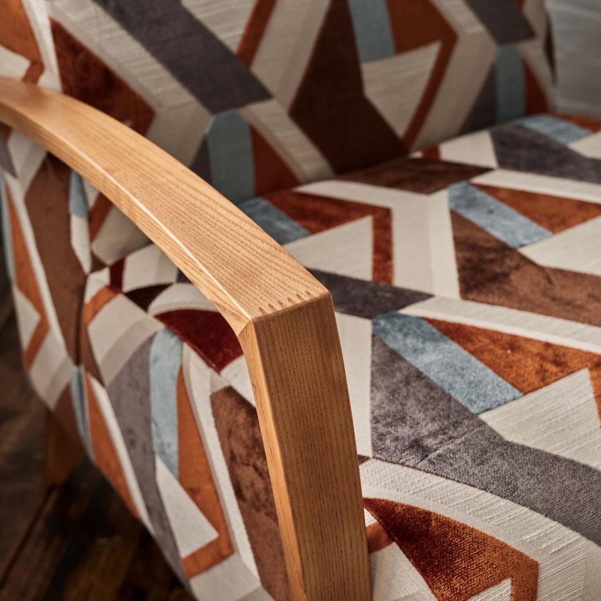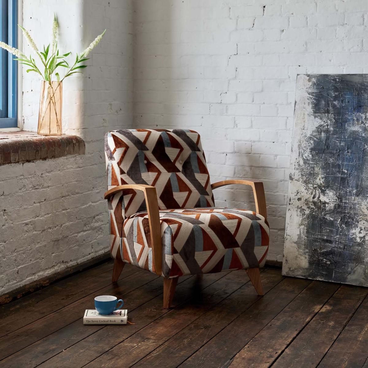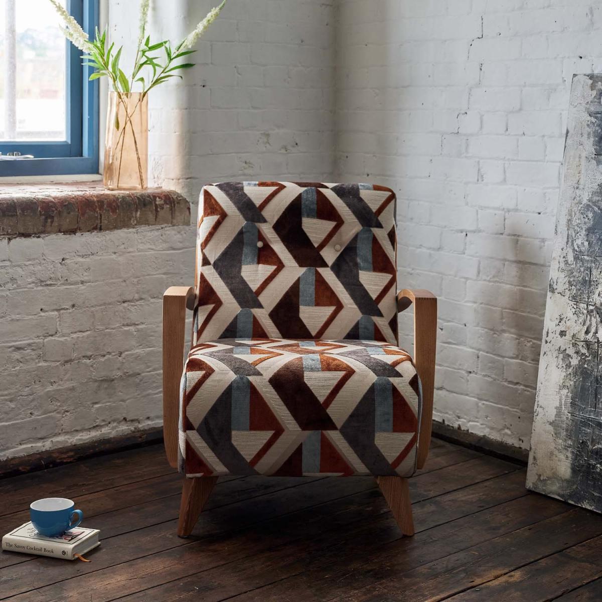 The Ibberton Chair is a luxurious accent to any living room or bedroom. Its patterned velvet upholstery combines with wooden arms and legs to create a stunning modern take on classic Scandinavian style, which is an ever-popular choice in interior design. The bold and vibrant tones of the multicoloured fabric perfectly complement and contrast the cosy aesthetic created by the weathered ash accents, producing a stylish yet supremely comfortable accent chair.