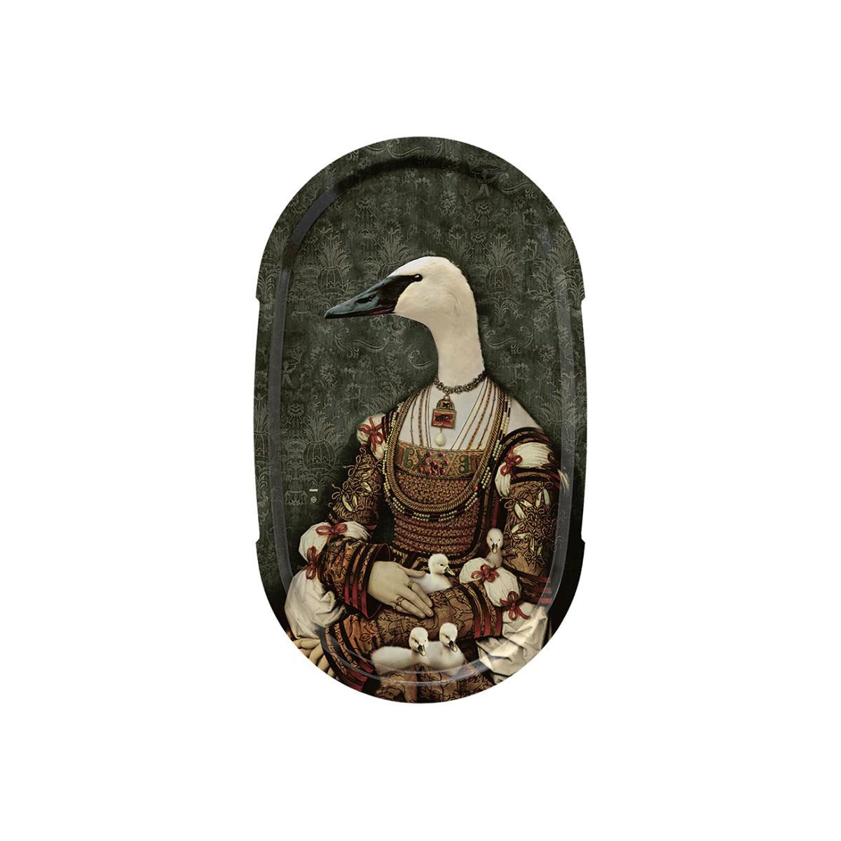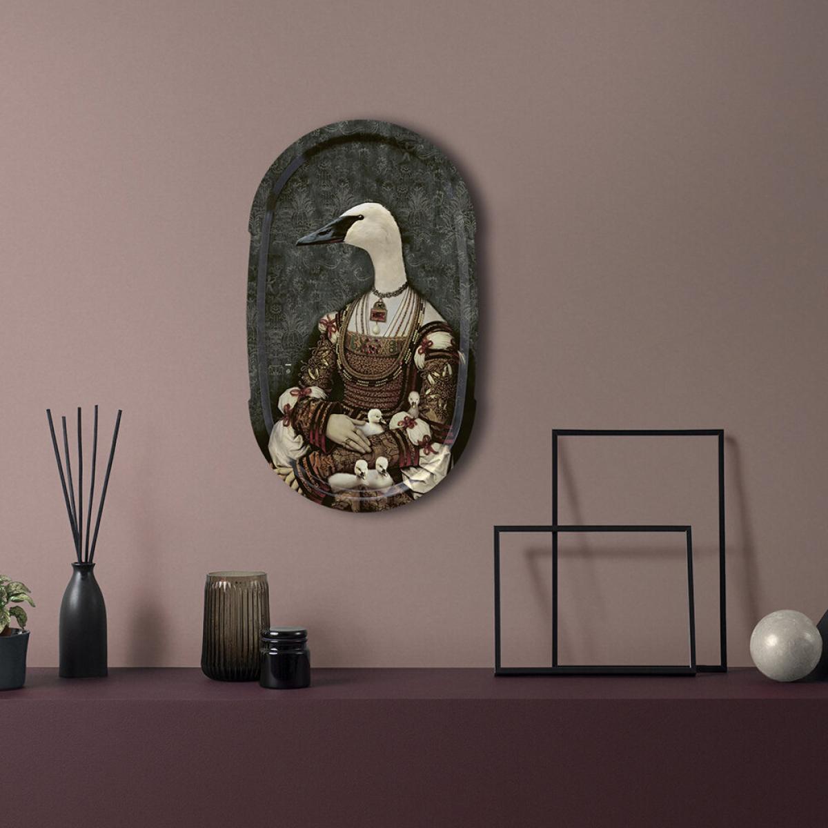 Create a statement in the home with this gorgeous Galerie de Portraits oval tray from ibride. Made from high pressure laminate this stunning tray features a traditional portrait painting in lavish clothes and setting. In a unique twist, the head is replaced with that of a beautiful bird creating a decorative piece inspired by nature. Finished with a hanging hole, this tray makes a quirky gift idea or addition to any interior space. This tray can also be hung on the wall to create a distinctive wall art display, with screws and caps included in the box to easily affix the tray to the wall via the laser cut holes in the laminate.