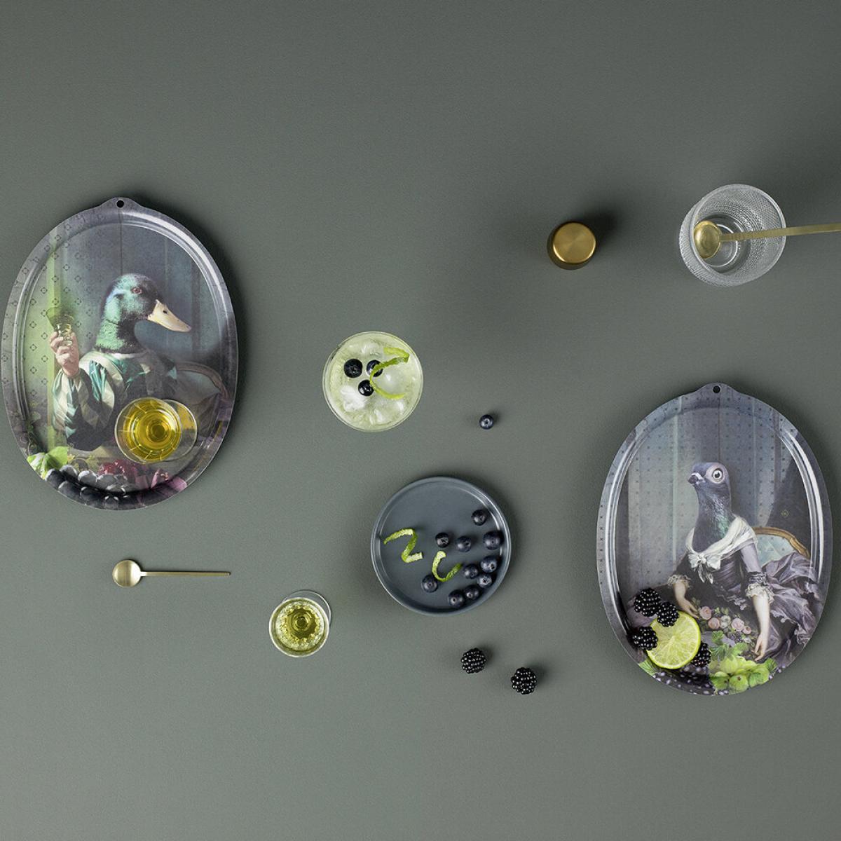 Create a statement in the home with this gorgeous Galerie de Portraits oval tray from ibride. Made from high pressure laminate this stunning tray features a traditional portrait painting in lavish clothes and setting. In a unique twist, the head is replaced with that of a beautiful bird creating a decorative piece inspired by nature. Finished with a hanging hole, this tray makes a quirky gift idea or addition to any interior space. This tray can also be hung on the wall to create a distinctive wall art display, with screws and caps included in the box to easily affix the tray to the wall via the laser cut holes in the laminate.