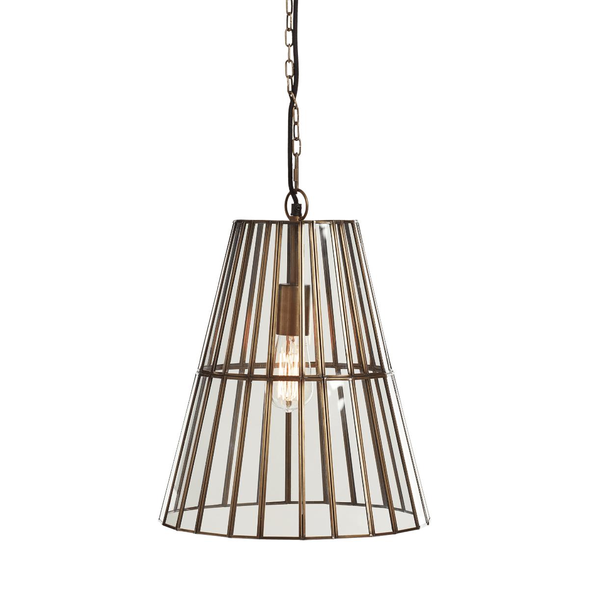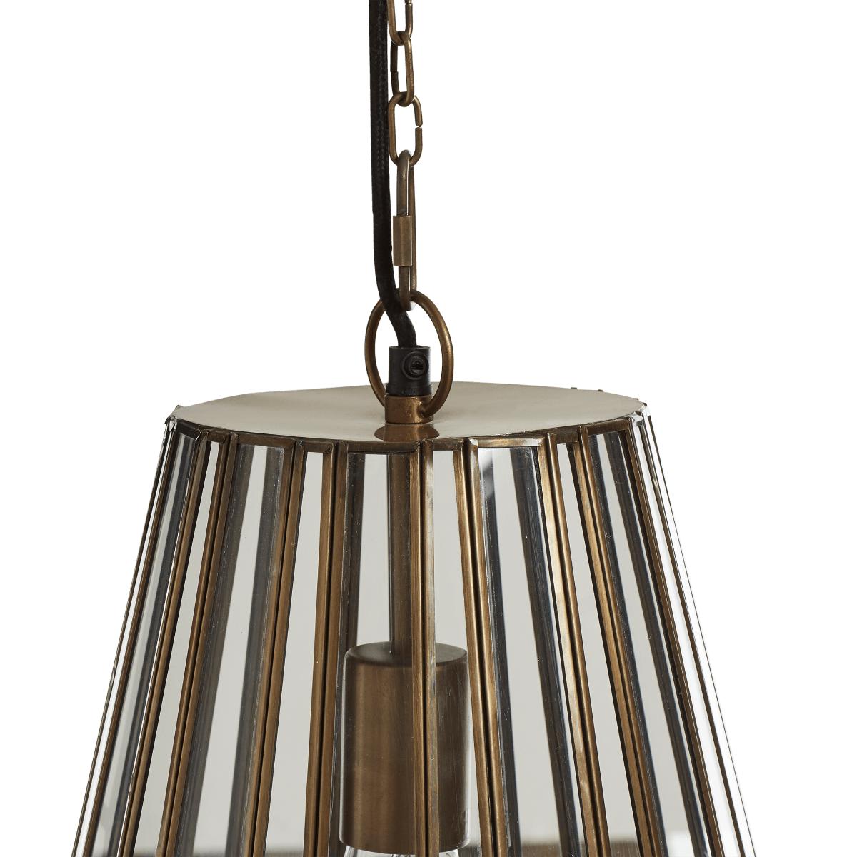 Whether the sun is shining or not, our Icarus Pendant Lamp will look striking hanging from the ceiling. Its steel structure is welded together by hand to enclose glass panels that will intensify the light when switched on. The metal is aged for an antique effect and a chain detail holds it up. Due to the manual process, each piece has individual characteristics and authentic markings that makes it unique.