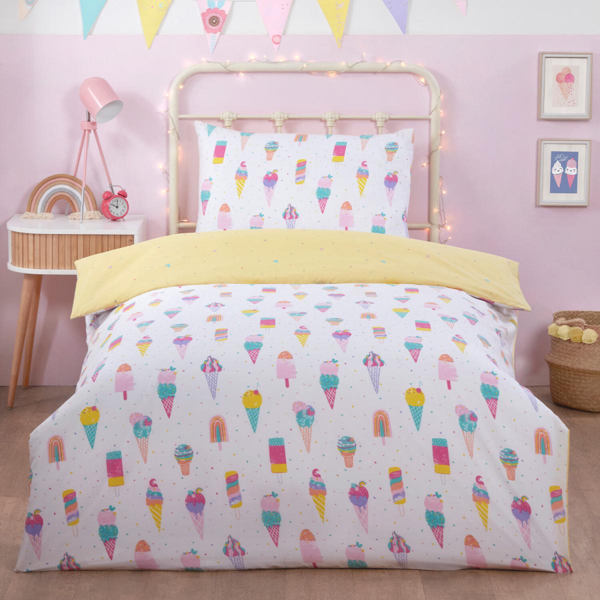 This ice cream duvet cover and pillowcase set is a fun choice for adding a playful pop of colour and personality to any child's bedroom. It works well in contemporary or pastel-themed kid's rooms, especially those with light or neutral walls, as the bright ice cream pattern creates an instant focal point. For styling, consider pairing it with soft, monochrome bed linens or minimalistic furniture to let the pattern really stand out. Accessories like pastel cushions or a plush for extra comfort can complete the look without overwhelming the space. It’s a practical pick for introducing colour and whimsy, while still offering a versatile and easy way to update the room’s aesthetic.