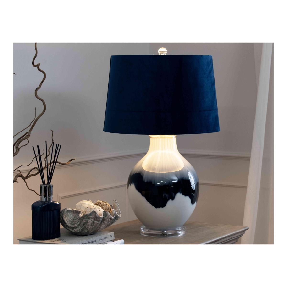 Why you'll love it This stunning ceramic table lamp brings light and colour to any room. Sophisticated contemporary style. Beautiful hand-dipped glaze in swirls of blue and white. Paired with a blue velvet lampshade. Finished with a glass ball-shaped finial. Handmade in India. This table lamp is part of the Furniture Village home accessories collection. What you need to know Glass base. Fabric lampshade, included. Requires 1 x E27 40W bulb. For indoor use only. To clean, wipe with a dry cloth. Base dimensions Height: 67 cm (27 in). Diameter: 38 cm (15 in). Shade dimensions Height: 27 cm (11 in). Diameter: 37 cm (15 in).