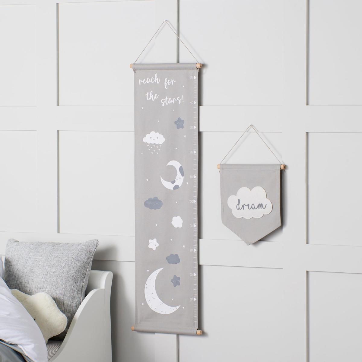 Decorate your space with these fun and uplifting wall hangings from Ickle Bubba’s Cosmic Aura collection. Featuring a stylish height chart to monitor your little one’s growth and inspirational wording with “dream” written on another wall hanging, this collective will spread style and encouragement in your nursery.