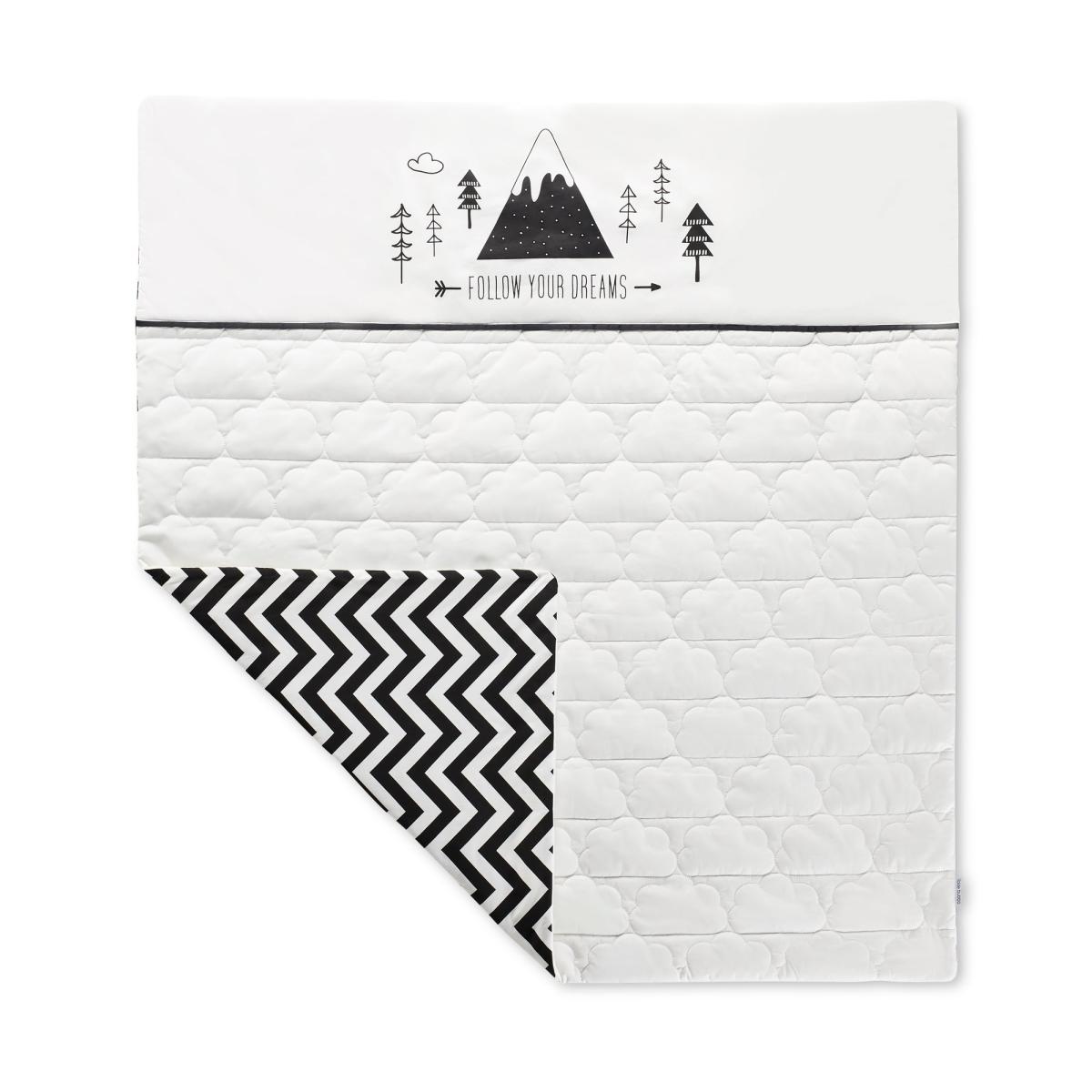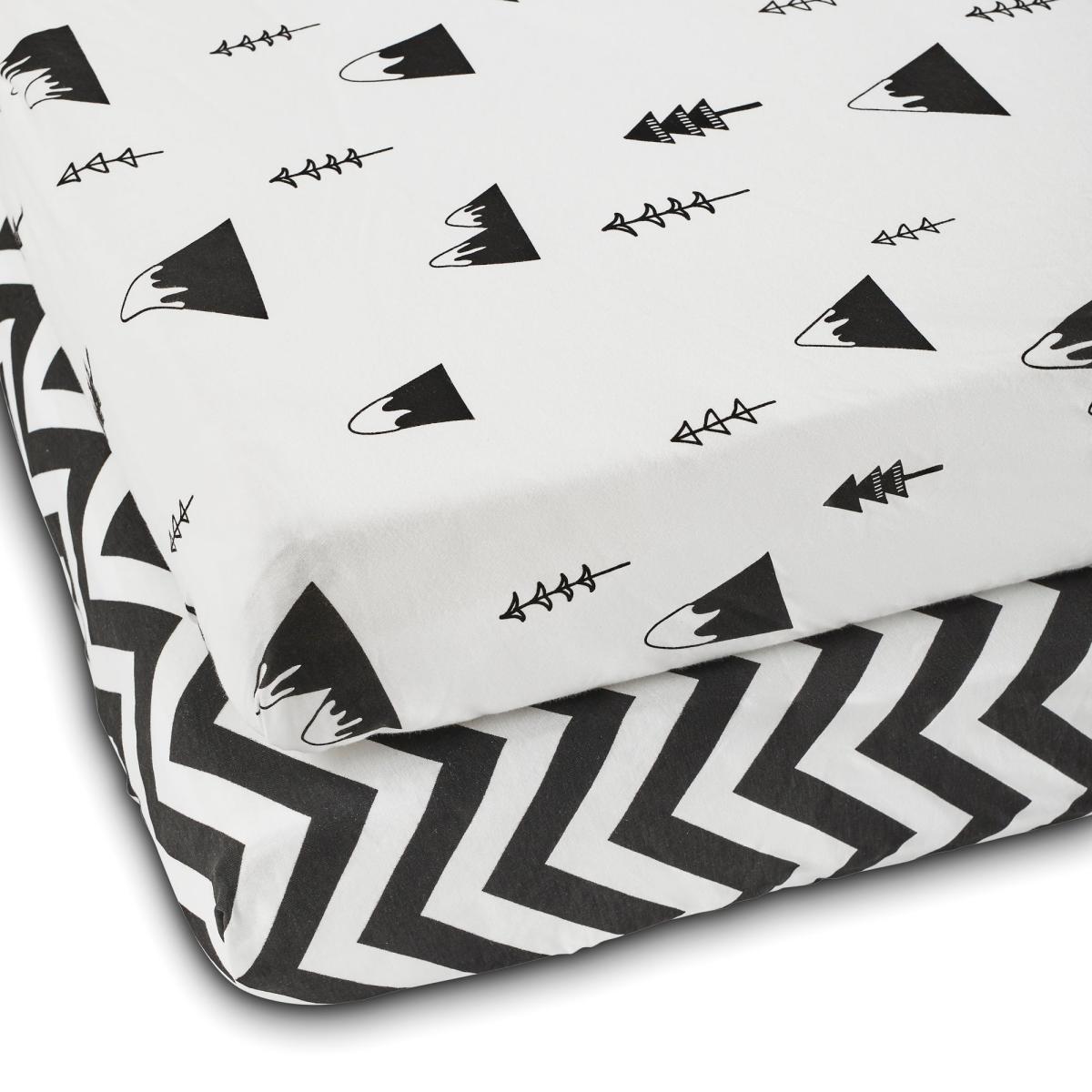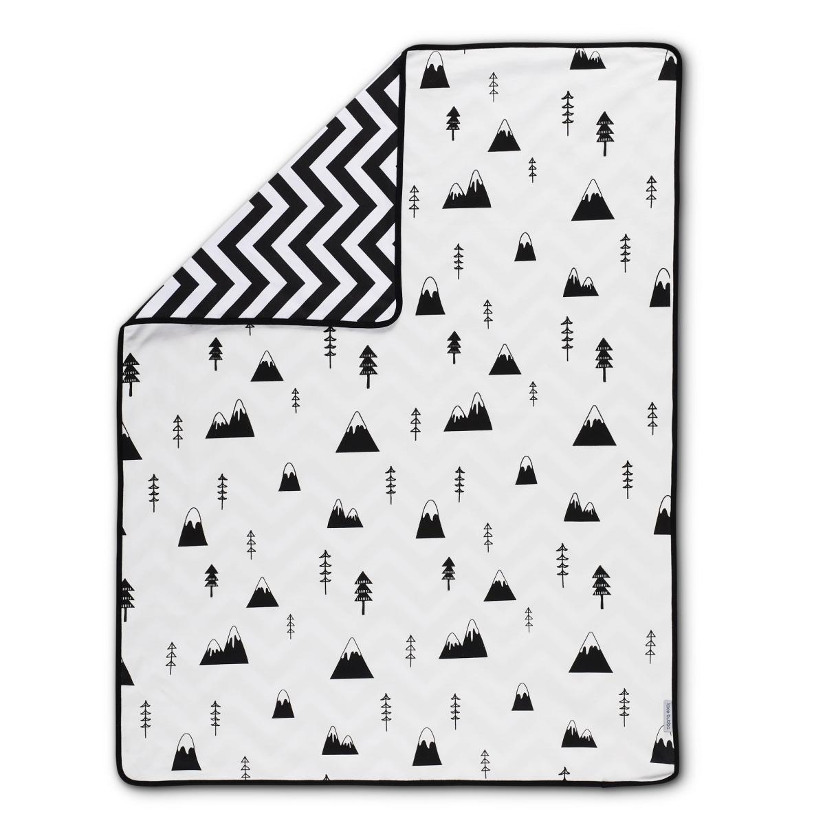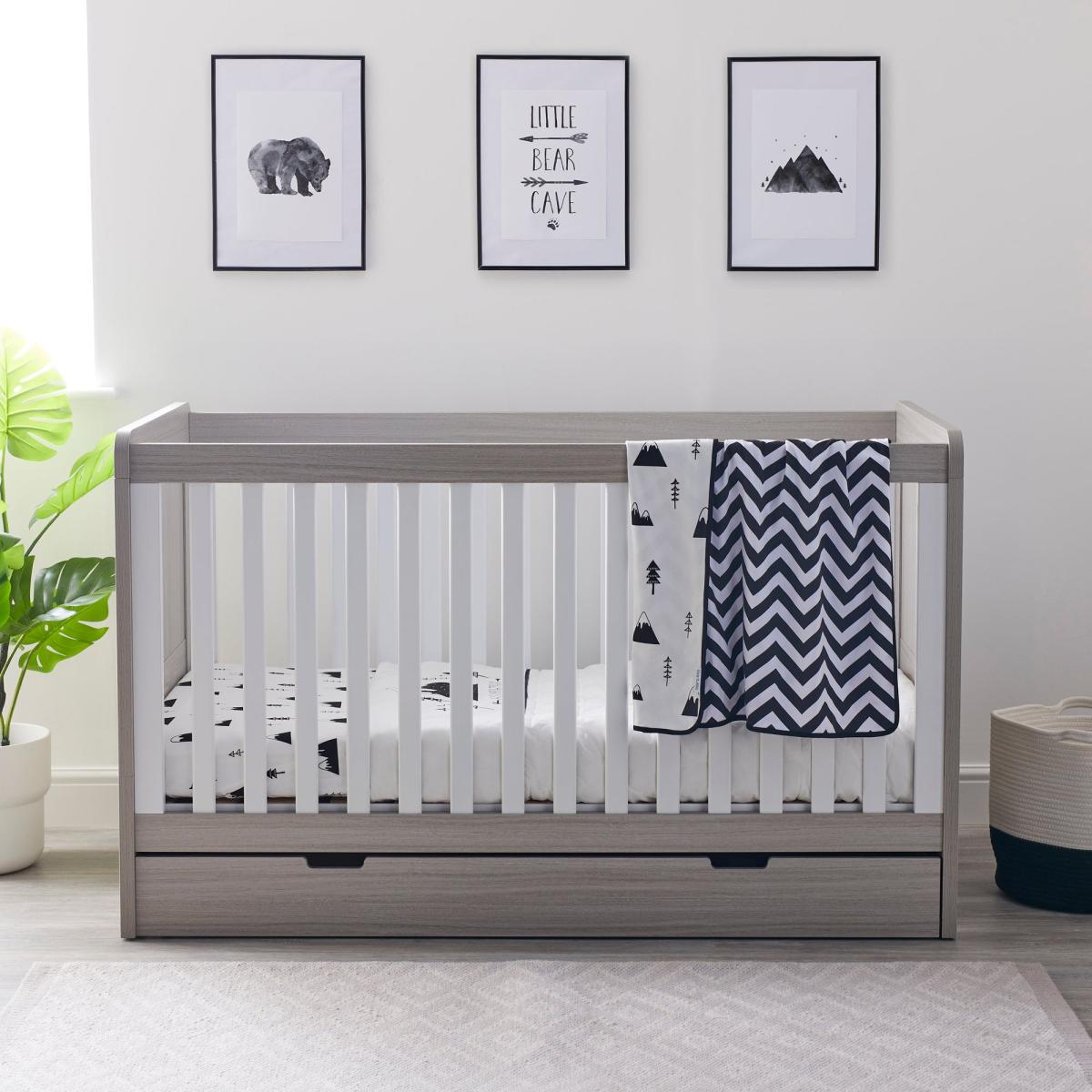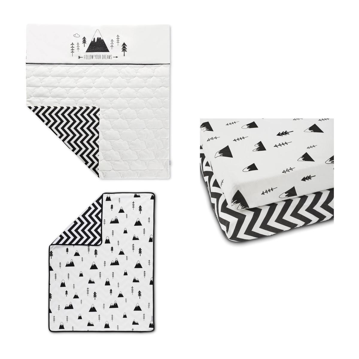 Keeping your little one cosy and snug during their nap times just got easier with this 4-piece bedding set offering great value, a coordinated look and kitting you out with essential bedding supplies to start up your little one’s nursery. Fitted sheets Perfect for your little one to rest upon and easy for you to quickly change the sheets when those little accidents happen, these fitted sheets are machine washable for easy cleaning, made from super soft cotton jersey and feature a monochrome zig zag pattern and alternative black and white mountain design to coordinate with the Mono Mountain collection. 2.5 Tog Quilt Layering up is perfect for your baby during the cooler nights with this 2.5 tog quilt featuring a monochrome design and complete with a tactile quilted cloud shape texture to ensure maximum cosiness while the double-sided design allows versatility and a changeable option Blanket Perfect for swaddling and wrapping your baby comfy and tight, this cotton jersey blanket features a versatile two-sided design so your little one will be wrapped in either a printed zig zag or mountain pattern.