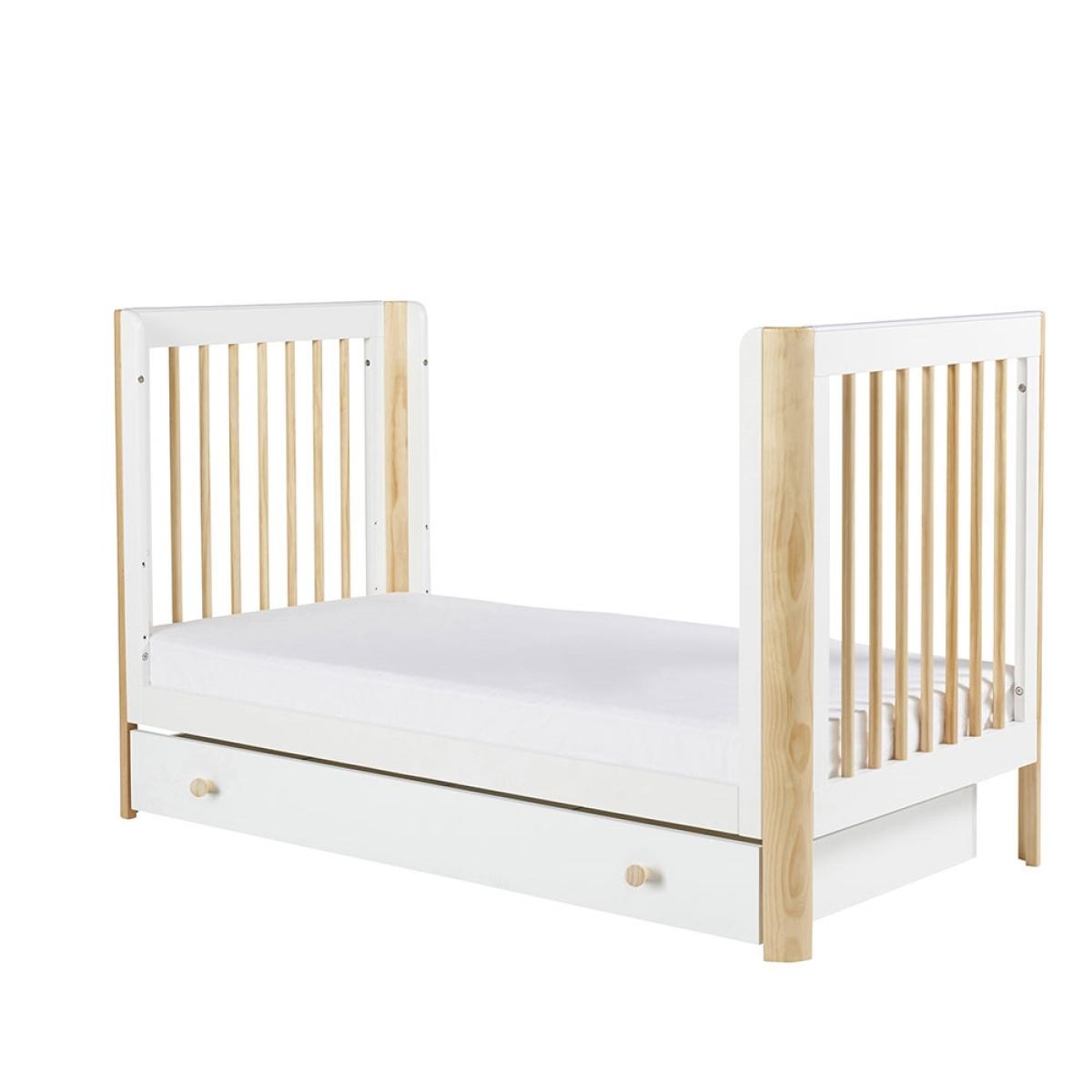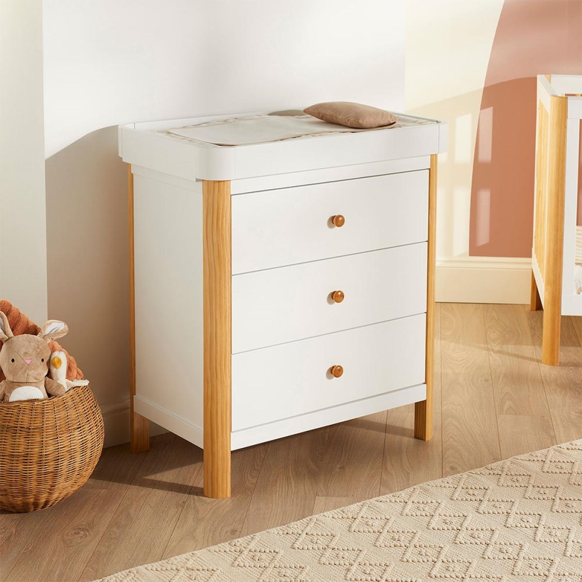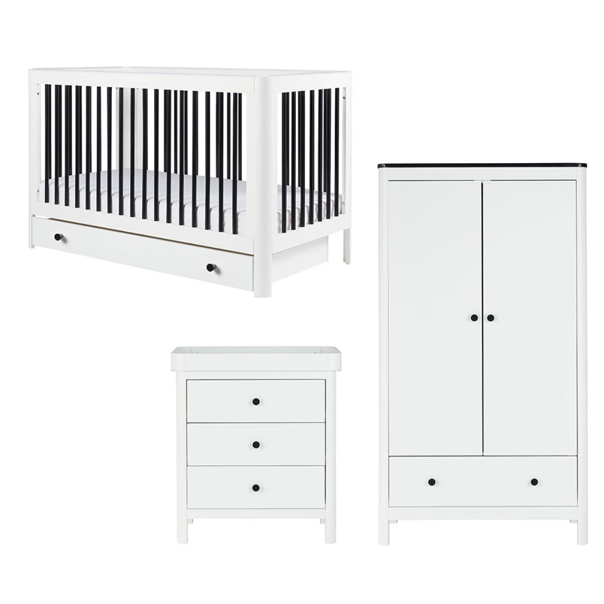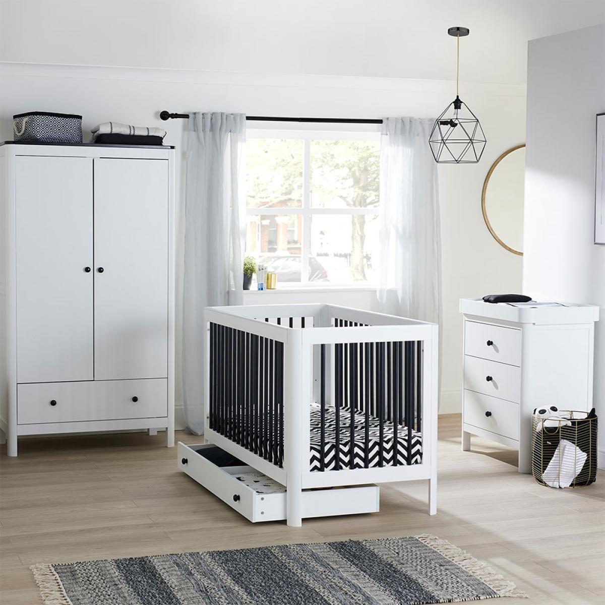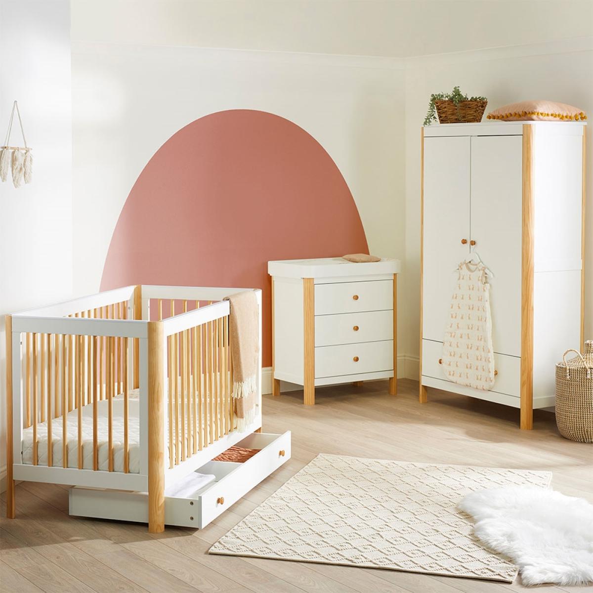 The Ickle Bubba Tenby Classic 3 Piece Furniture Set and Under Drawer comes in a choice of neutral colourways, making it perfect for any style of nursery bedding and decor! Pairing a convertible cot bed with a baby changing unit and double wardrobe - each stylish design is packed with practical features for babies and parents. Suitable from birth until the age of 4, the cot bed includes teething rails, 3 adjustable base heights and rounded slats to create a safe and secure space for sleeping! When they're ready, the toddler bed stages make the transition to a big kids bed a much less daunting prospect. The removable guard rails and side panels offer added reassurance to tentative tots. The additional underbed storage drawer can be used at every stage too, making better use of that otherwise unused space. You'll be seeing a lot of the baby changing unit, but thanks to the removable changing top and spacious drawers, cleanups are made quicker! The double wardrobe opens up to reveal 2 hanging rails for all of their tiny outfits and the storage drawer below is great for additional bedding. With plenty of features to see you through their first years, the Tenby nursery set creates a stylish and usable space for you and your new arrival!.