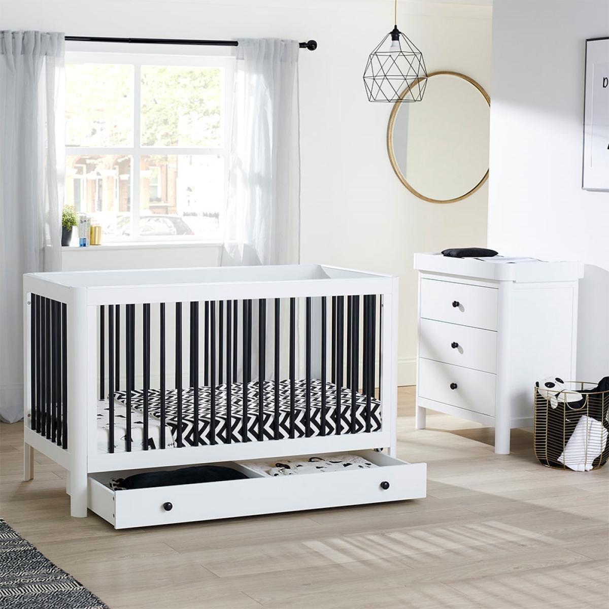 The Ickle Bubba Tenby Classic Cot Bed with Under Drawer and Changing Unit nursery set offers the perfect mix of practical features and Scandi style. Available in a choice of two-tone colourways, it's easy to pair with any bedding and decor you decide on! Starting out with teething rails and 3 adjustable base heights, the Tenby Cot Bed keeps little one's safe and secure. Suitable from birth until the age of 4, the convertible cot bed transforms into toddler bed stages when your tot is ready. With the choice of guard rails and keeping slatted sides in place for added reassurance, ease them into getting their 'big kids' bed with these smaller steps and make the transition a painless one. The extra underbed storage drawer can be used at every step! How handy is that?! Paired with a baby changing unit, other essentials can be stored in the 3 spacious storage drawers while you fuss over your little love on the removable changing top above. When nappies are done with, continue using the chest of drawers throughout their childhood!.