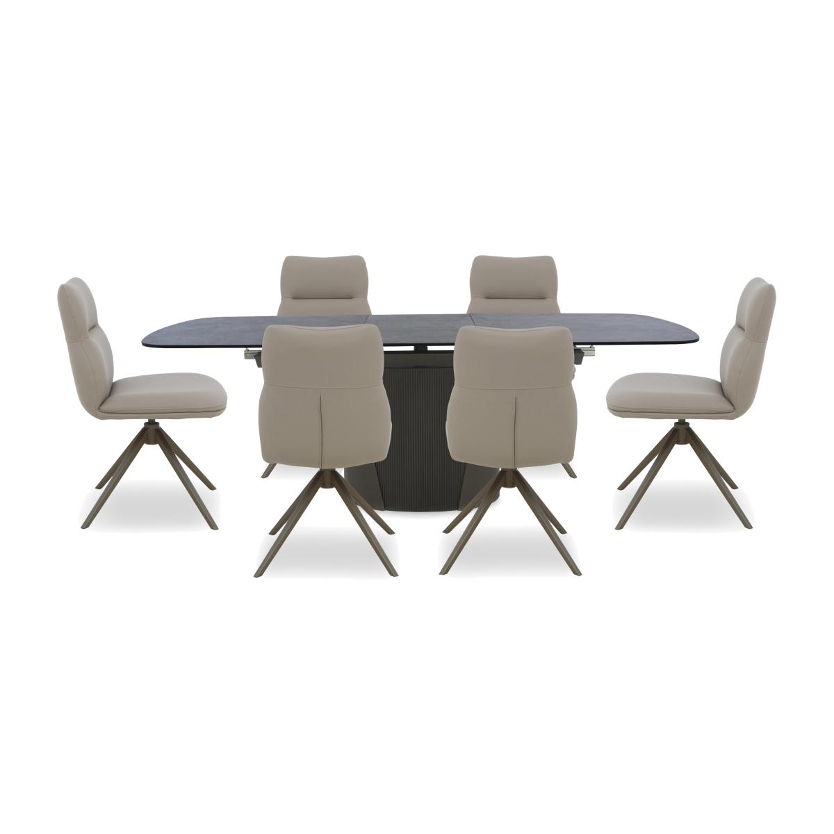 We couldn’t help but award this range of stunning dining room furniture iconic status and it’s easy to see why. The Icon collection’s showstopping extending dining table has a stunning ceramic top in a choice of colours. Bonded to glass, it’s every bit as hardwearing as it is beautiful. And this dining table’s pedestal base is definitely a masterpiece of modern design, finished in metal and embellished with fluting. Create your own fabulous dining set by pairing the extending dining table in your favourite finish with a set of the range’s elegant swivel dining chairs. Or just leave it to the experts and browse our wide selection of Icon dining sets, beautifully curated by our design team. With its bronze ceramic-topped dining table with statement metal-finished base and set of six Icon dining chairs with bronze legs, it’s easy to see why this dining set deserves its iconic status. Why you'll love it Bring home iconic dining room style. Distinctive, unique and bold, our Icon range really stands out. This oval extending dining table in this set is absolutely stunning. Stunning ceramic top in a beautiful bronze colour. A rotating section swivels to extend this table in seconds. Showstopping fluted metal pedestal base with a rich bronze-toned finish. Bonded to tempered glass, the ceramic table top is incredibly hardwearing. It’s also heatproof, scratch-resistant and chip-resistant. Dining table is available in 2 sizes. Dining set includes 6 Icon dining chairs with curved fluted backs. Beautifully soft faux leather upholstery in a choice of taupe shades. Auto-return swivel mechanism with bronze-finished metal legs. This dining set is part of the Icon range. What you need to know Dining chairs have metal frames and legs and are cushioned with foam. The small 160 cm dining table seats 6 closed and 8 when extended to 200 cm. The large 180 cm dining table seats 8 closed and 10 when extended to 230 cm. This dining table is very heavy and should not be moved once in place. We recommend using coasters and placemats at all times. Easy to care for. Simply wipe with a clean, damp cloth and dry with a soft duster. Do not use abrasive cleaning products. Item code: ICONDS6BLTB-001
