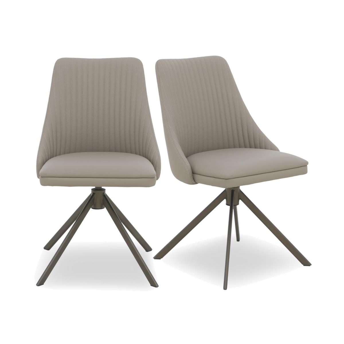 We couldn’t help but award this range of stunning dining room furniture iconic status and it’s easy to see why. The Icon collection’s showstopping extending dining table has a stunning ceramic top in a choice of colours. Bonded to glass, it’s every bit as hardwearing as it is beautiful. And this dining table’s pedestal base is definitely a masterpiece of modern design, finished in metal and embellished with fluting. Create your own fabulous dining set by pairing the extending dining table in your favourite finish with a set of the range’s elegant swivel dining chairs. Or just leave it to the experts and browse our wide selection of Icon dining sets, beautifully curated by our design team. With stylish metal legs and elegantly curved backs with fluting, it’s easy to see why this pair of swivel dining chairs deserves its iconic status. Part of the Icon range of statement dining room furniture. Why you'll love it Bring home iconic dining room style. Distinctive, unique and bold, our Icon range really stands out. Pair of statement swivel dining chairs with curved backs and stylish fluting. Beautifully soft faux leather upholstery offered in 2 fashionable taupe shades. Choice of metal finish for the legs. Swivel base automatically returns to its original position, facing forward. Also available individually and in sets of 4 and 6 dining chairs. This pair of swivel dining chairs is part of the Icon range. What you need to know Metal frame and legs. Cushioned with foam. Item code: ICON2CHLTB-001