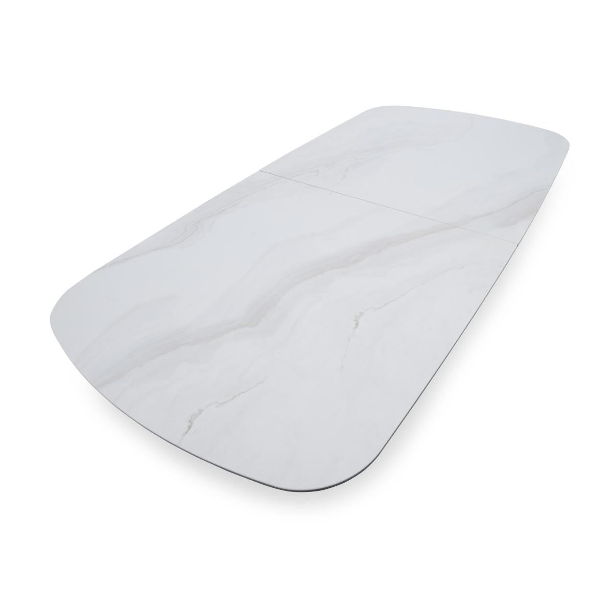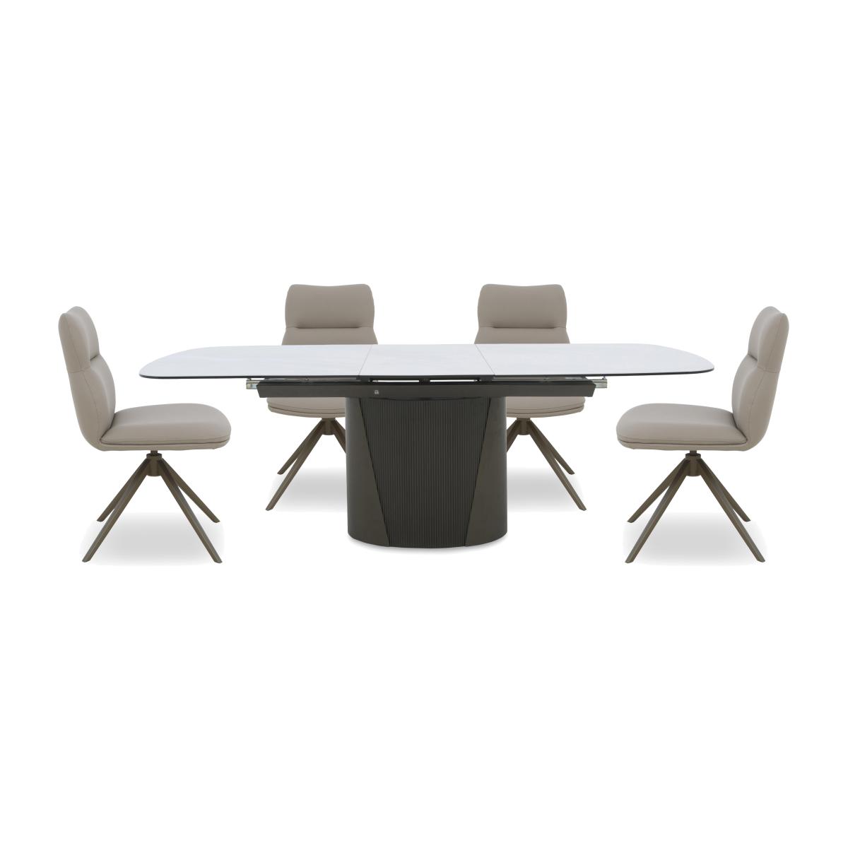 We couldn’t help but award this range of stunning dining room furniture iconic status and it’s easy to see why. The Icon collection’s showstopping extending dining table has a stunning ceramic top in a choice of colours. Bonded to glass, it’s every bit as hardwearing as it is beautiful. And this dining table’s pedestal base is definitely a masterpiece of modern design, finished in metal and embellished with fluting. Create your own fabulous dining set by pairing the extending dining table in your favourite finish with a set of the range’s elegant swivel dining chairs. Or just leave it to the experts and browse our wide selection of Icon dining sets, beautifully curated by our design team. With its white ceramic-topped dining table with statement metal-finished base and set of four Diva dining chairs with bronze legs, it’s easy to see why this dining set deserves its iconic status. Why you'll love it Bring home iconic dining room style. Distinctive, unique and bold, our Icon range really stands out. This oval extending dining table in this set is absolutely stunning. Stunning matt white ceramic top. A rotating section swivels to extend this table in seconds. Showstopping fluted metal pedestal base with a rich bronze-toned finish. Bonded to tempered glass, the ceramic table top is incredibly hardwearing. It’s also heatproof, scratch-resistant and chip-resistant. Dining table is available in 2 sizes. Dining set includes 4 elegant and glam Diva dining chairs. Beautifully soft faux leather upholstery in a choice of taupe shades. Auto-return swivel mechanism with bronze-finished metal legs. This dining set is part of the Icon range. What you need to know Dining chairs have metal frames and legs and are cushioned with foam. The small 160 cm dining table seats 6 closed and 8 when extended to 200 cm. The large 180 cm dining table seats 8 closed and 10 when extended to 230 cm. This dining table is very heavy and should not be moved once in place. We recommend using coasters and placemats at all times. Easy to care for. Simply wipe with a clean, damp cloth and dry with a soft duster. Do not use abrasive cleaning products. Item code: ICONDS1WLTB-001