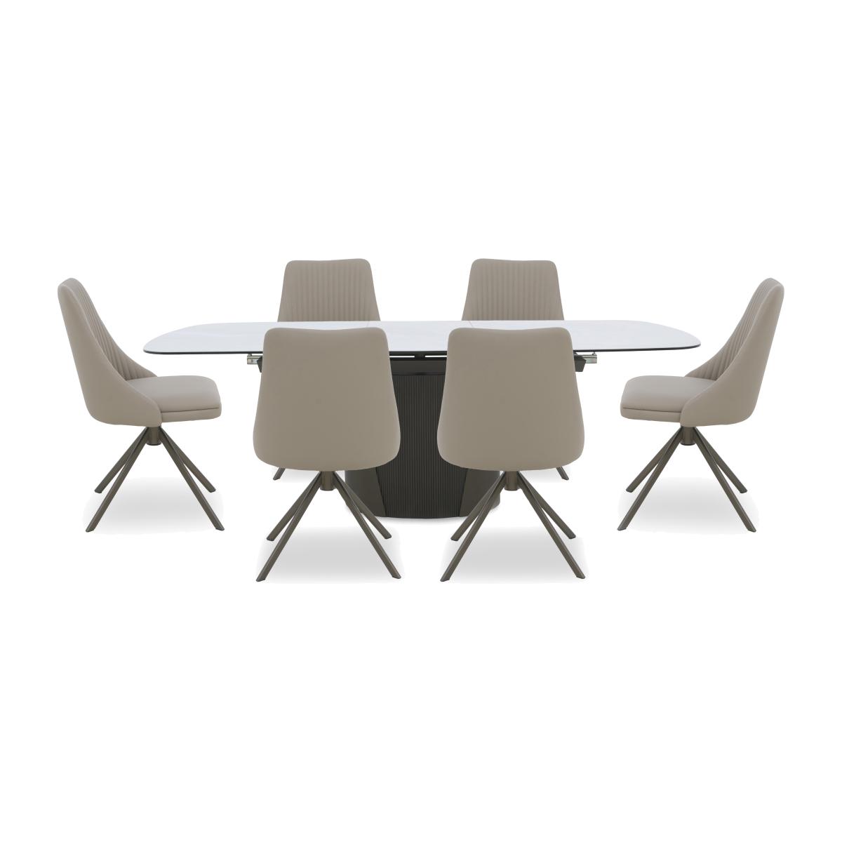 We couldn’t help but award this range of stunning dining room furniture iconic status and it’s easy to see why. The Icon collection’s showstopping extending dining table has a stunning ceramic top in a choice of colours. Bonded to glass, it’s every bit as hardwearing as it is beautiful. And this dining table’s pedestal base is definitely a masterpiece of modern design, finished in metal and embellished with fluting. Create your own fabulous dining set by pairing the extending dining table in your favourite finish with a set of the range’s elegant swivel dining chairs. Or just leave it to the experts and browse our wide selection of Icon dining sets, beautifully curated by our design team. With its white ceramic-topped dining table with statement metal-finished base and set of six Icon dining chairs with bronze legs, it’s easy to see why this dining set deserves its iconic status. Why you'll love it Bring home iconic dining room style. Distinctive, unique and bold, our Icon range really stands out. This oval extending dining table in this set is absolutely stunning. Stunning matt white ceramic top. A rotating section swivels to extend this table in seconds. Showstopping fluted metal pedestal base with a rich bronze-toned finish. Bonded to tempered glass, the ceramic table top is incredibly hardwearing. It’s also heatproof, scratch-resistant and chip-resistant. Dining table is available in 2 sizes. Dining set includes 6 Icon dining chairs with curved fluted backs. Beautifully soft faux leather upholstery in a choice of taupe shades. Auto-return swivel mechanism with bronze-finished metal legs. This dining set is part of the Icon range. What you need to know Dining chairs have metal frames and legs and are cushioned with foam. The small 160 cm dining table seats 6 closed and 8 when extended to 200 cm. The large 180 cm dining table seats 8 closed and 10 when extended to 230 cm. This dining table is very heavy and should not be moved once in place. We recommend using coasters and placemats at all times. Easy to care for. Simply wipe with a clean, damp cloth and dry with a soft duster. Do not use abrasive cleaning products. Item code: ICONDS6WLTB-001