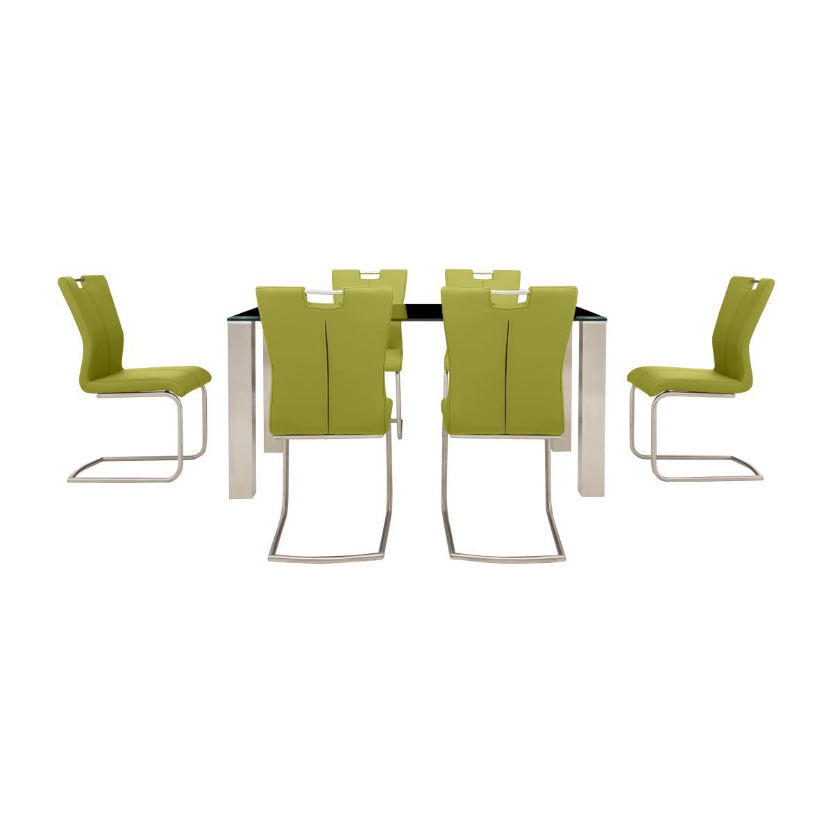 Got a clever idea for your kitchen diner or dining room? Ideas can make it happen. Cool, contemporary and highly customisable, the Ideas dining collection makes it easy to create the perfect dining set for you and your home. Both the dining table and bar table are available in a choice of four different glass tops and two different leg finishes. Dining chairs and bar stools feature a selection of stylish bases and come in ten fabulous colours for the faux leather upholstery. Simply mix and match colours, styles and finishes and make something amazing. Fantastic value, fabulous style – that’s Ideas. Take your meals to the next level with this striking minimalist dining set. It’s sleek and sophisticated with statement steel legs and faux-leather chairs. Why you’ll love it. Sleek and minimalist design at a great-value price. Ultra-modern style that takes centre stage in any dining space. Six contemporary faux-leather cantilevered chairs in a choice of colours. Opt for stainless steel or industrial-style black powder-coated steel legs. Square-edged legs make an instant style statement. The black glass top is easy to clean and super-practical. What you need to know. Use placemats and coasters at all times to avoid scratching the surface. Simply mop spills with a damp cloth. Avoid using abrasive clothes or cleaning materials. A compact bar table and a wide selection of dining sets are also available.
