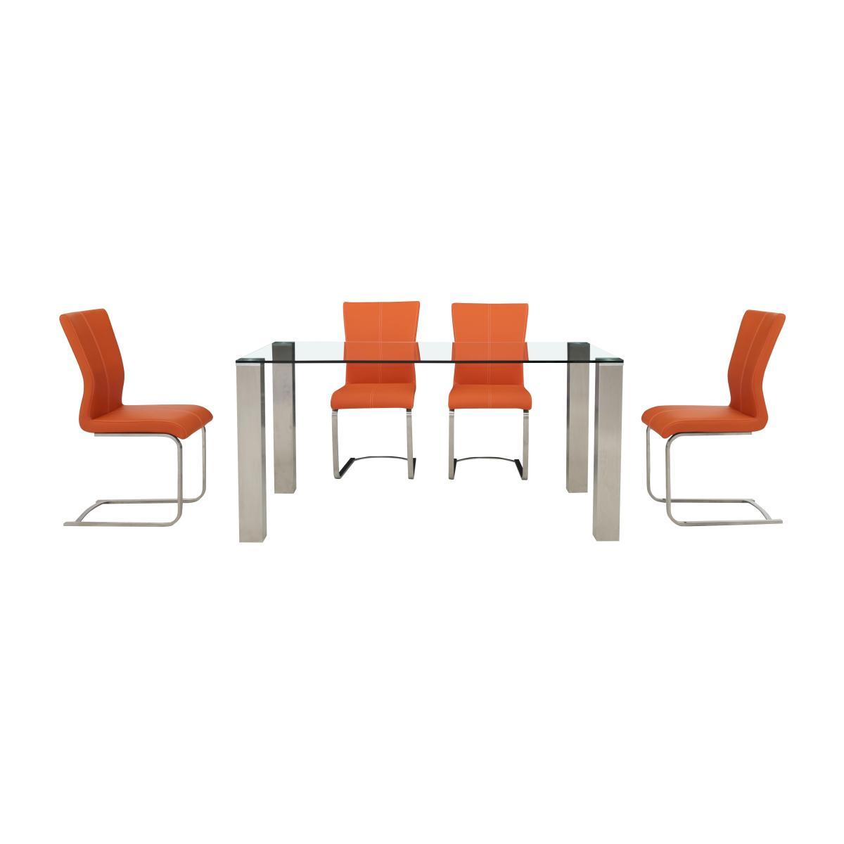 Got a clever idea for your kitchen diner or dining room? Ideas can make it happen. Cool, contemporary and highly customisable, the Ideas dining collection makes it easy to create the perfect dining set for you and your home. Both the dining table and bar table are available in a choice of four different glass tops and two different leg finishes. Dining chairs and bar stools feature a selection of stylish bases and come in ten fabulous colours for the faux leather upholstery. Simply mix and match colours, styles and finishes and make something amazing. Fantastic value, fabulous style – that’s Ideas. Everything about this dining set makes a statement, from its sleek steel legs to its glass tabletop and modern faux-leather chairs. Why you’ll love it. Sleek and minimalist design at a great-value price. Ultra-modern style that takes centre stage in any dining space. Four contemporary faux-leather cantilevered chairs in a choice of colours. Opt for stainless steel or industrial-style black powder-coated steel legs. Square-edged legs make an instant style statement. The clear glass top is easy to clean and super-practical. What you need to know. Use placemats and coasters at all times to avoid scratching the surface. Simply mop spills with a damp cloth. Avoid using abrasive clothes or cleaning materials. A compact bar table and a wide selection of dining sets are also available.