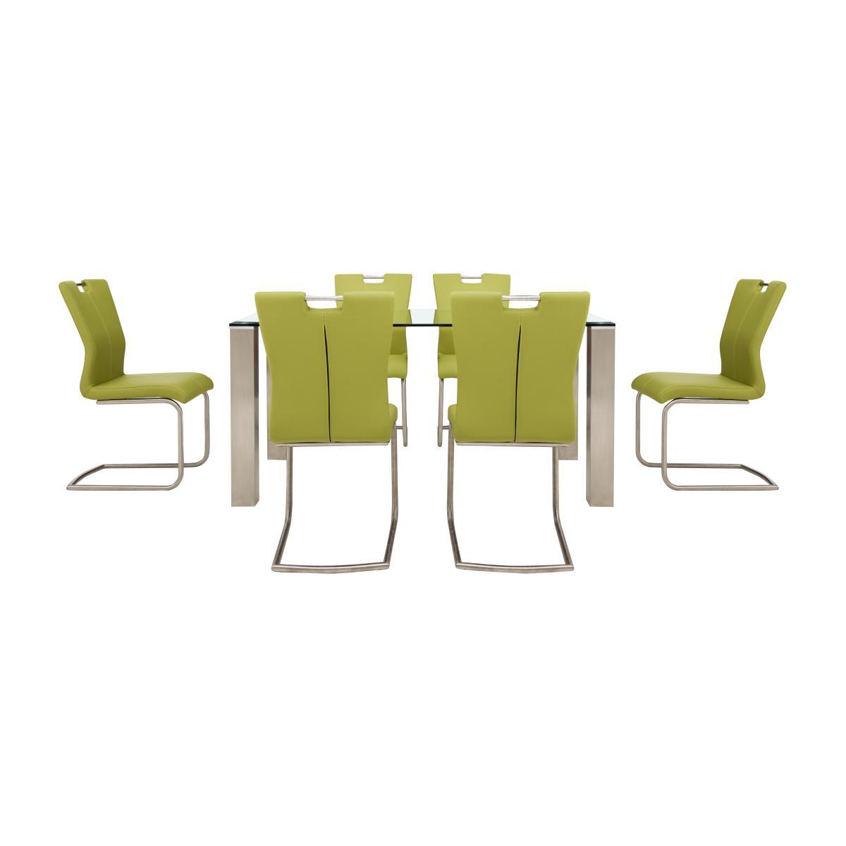 Got a clever idea for your kitchen diner or dining room? Ideas can make it happen. Cool, contemporary and highly customisable, the Ideas dining collection makes it easy to create the perfect dining set for you and your home. Both the dining table and bar table are available in a choice of four different glass tops and two different leg finishes. Dining chairs and bar stools feature a selection of stylish bases and come in ten fabulous colours for the faux leather upholstery. Simply mix and match colours, styles and finishes and make something amazing. Fantastic value, fabulous style – that’s Ideas. Minimalist design meets urban cool in this contemporary dining set. Statement steel legs, a space-opening glass tabletop and on-trend faux-leather chairs. Why you’ll love it. Sleek and minimalist design at a great-value price. Ultra-modern style that takes centre stage in any dining space. Six contemporary faux-leather cantilevered chairs in a choice of colours. Opt for stainless steel or industrial-style black powder-coated steel legs. Square-edged legs make an instant style statement. The clear glass top is easy to clean and super-practical. What you need to know. Use placemats and coasters at all times to avoid scratching the surface. Simply mop spills with a damp cloth. Avoid using abrasive clothes or cleaning materials. A compact bar table and a wide selection of dining sets are also available.