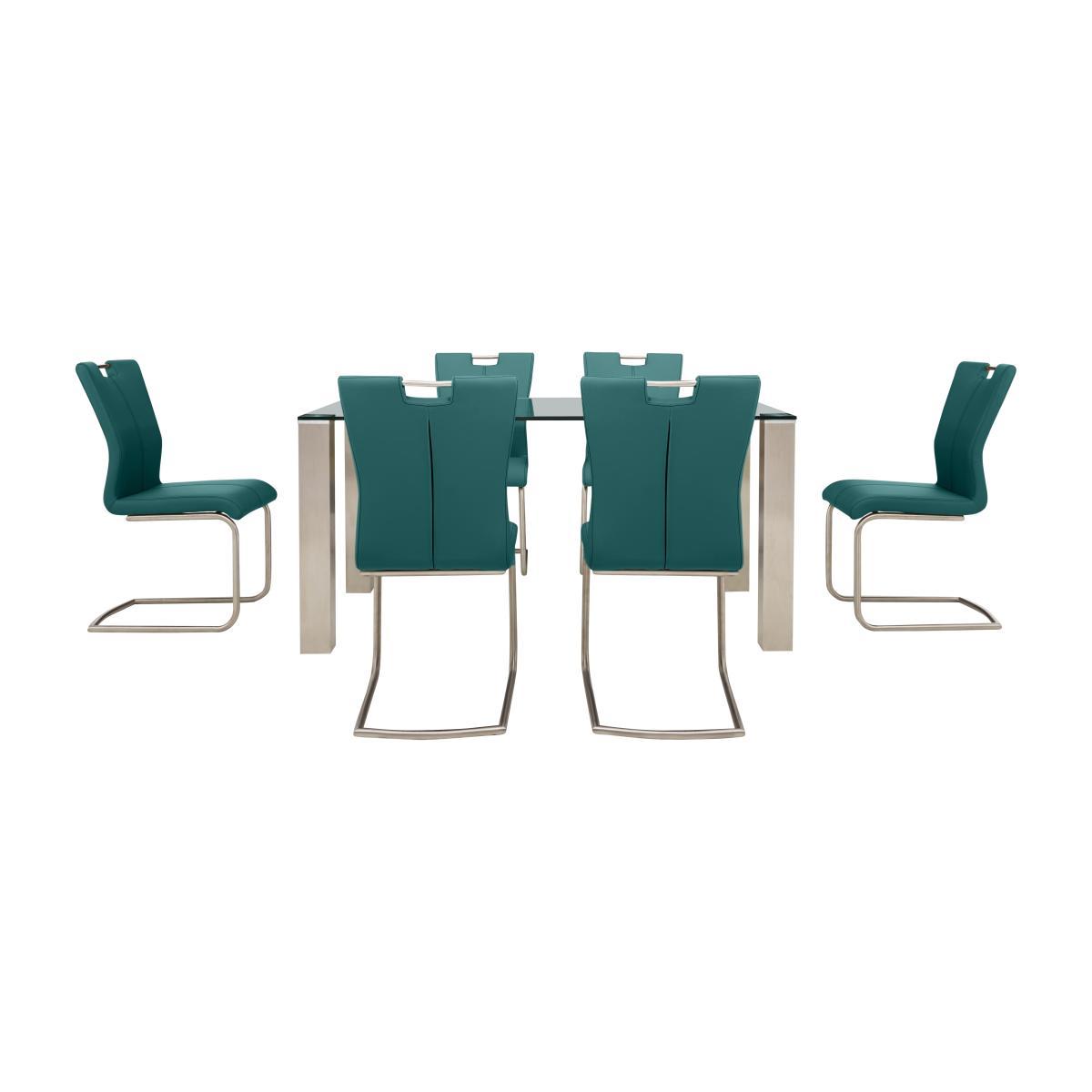 Got a clever idea for your kitchen diner or dining room? Ideas can make it happen. Cool, contemporary and highly customisable, the Ideas dining collection makes it easy to create the perfect dining set for you and your home. Both the dining table and bar table are available in a choice of four different glass tops and two different leg finishes. Dining chairs and bar stools feature a selection of stylish bases and come in ten fabulous colours for the faux leather upholstery. Simply mix and match colours, styles and finishes and make something amazing. Fantastic value, fabulous style – that’s Ideas. Entertain in style with this ultra-modern dining set. Statement steel legs, a sleek glass tabletop and faux-leather cantilevered chairs – what’s not to love?. Why you’ll love it. Sleek and minimalist design at a great-value price. Ultra-modern style that takes centre stage in any dining space. Six contemporary faux-leather cantilevered chairs in a choice of colours. Opt for stainless steel or industrial-style black powder-coated steel legs. Square-edged legs make an instant style statement. The grey glass top is easy to clean and super-practical. What you need to know. Use placemats and coasters at all times to avoid scratching the surface. Simply mop spills with a damp cloth. Avoid using abrasive clothes or cleaning materials. A compact bar table and a wide selection of dining sets are also available.