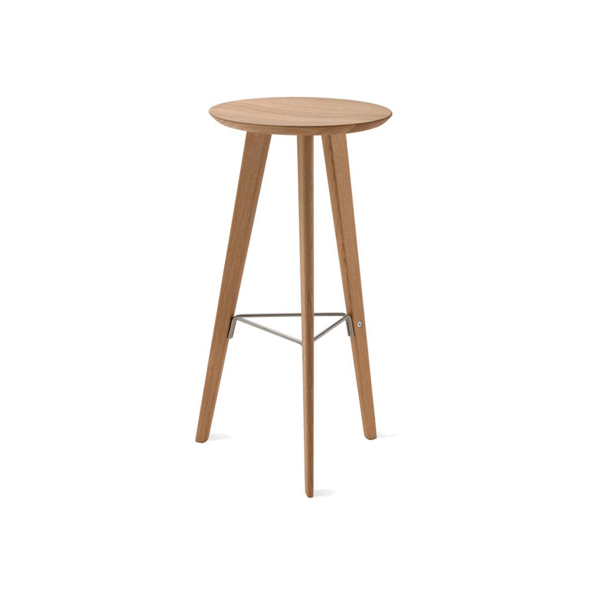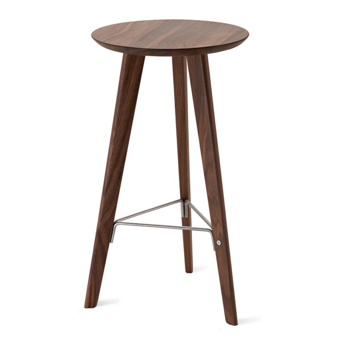 The Ido Counter Stool was designed by Frank Rettenbacher and presents clean lines of oak or walnut wood in a contemporary structure made up of three elegantly splayed legs that lead to a tapered disc that constitutes the seat. Perfect for enhancing a breakfast bar or high table area, the Ido Stool’s wood has been painted with a natural treatment to enhance the wood’s natural grain, ensuring that the material matches the elegance of the design’s form. With a subtle footrest in satin-finished steel, the Ido Stool in walnut looks great in pairs or grouped and would make an informed addition to your dining or living area.