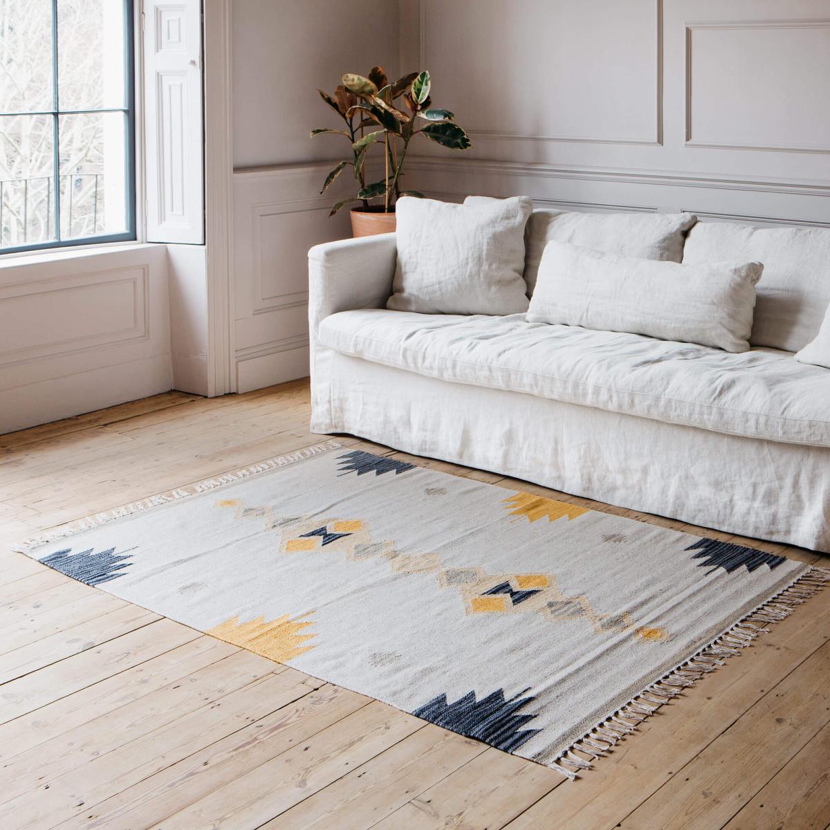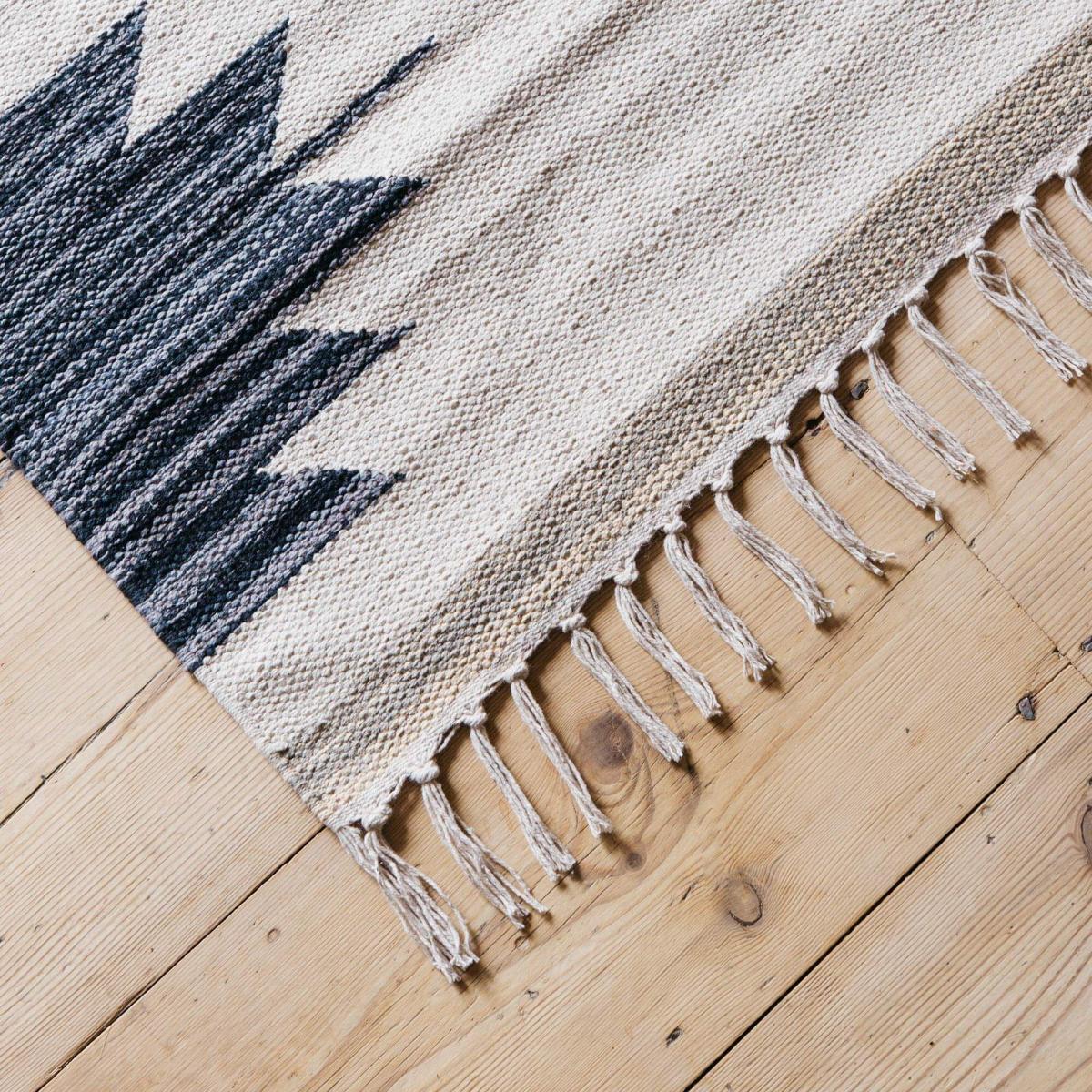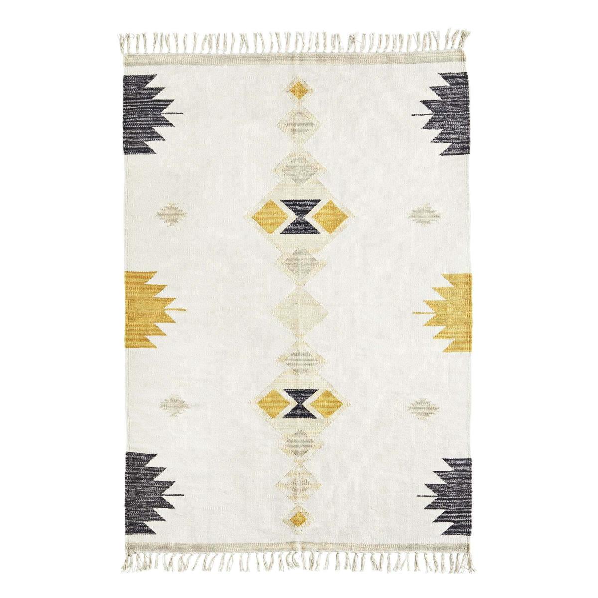A brightly coloured rug with an Aztec style print and finished with fringed edges, each one is handwoven from cotton to be unique in your home.