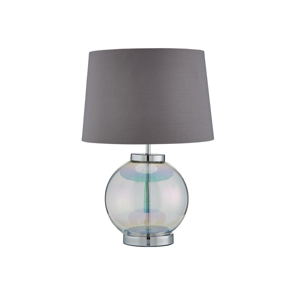 Create a relaxing lighting atmosphere with the Idris Iridescent Round Table Lamp in Smoke. The sleek chrome detailing brings a contemporary touch to the design and matches most interiors seamlessly. The main feature of this lamp is it's show-stopping iridescent glass ball. This feature reflects the calming light that is emitted from the grey lamp shade. This classic touch brings an element of elegance to your home and would look ideal on a bedside table or in a living room.