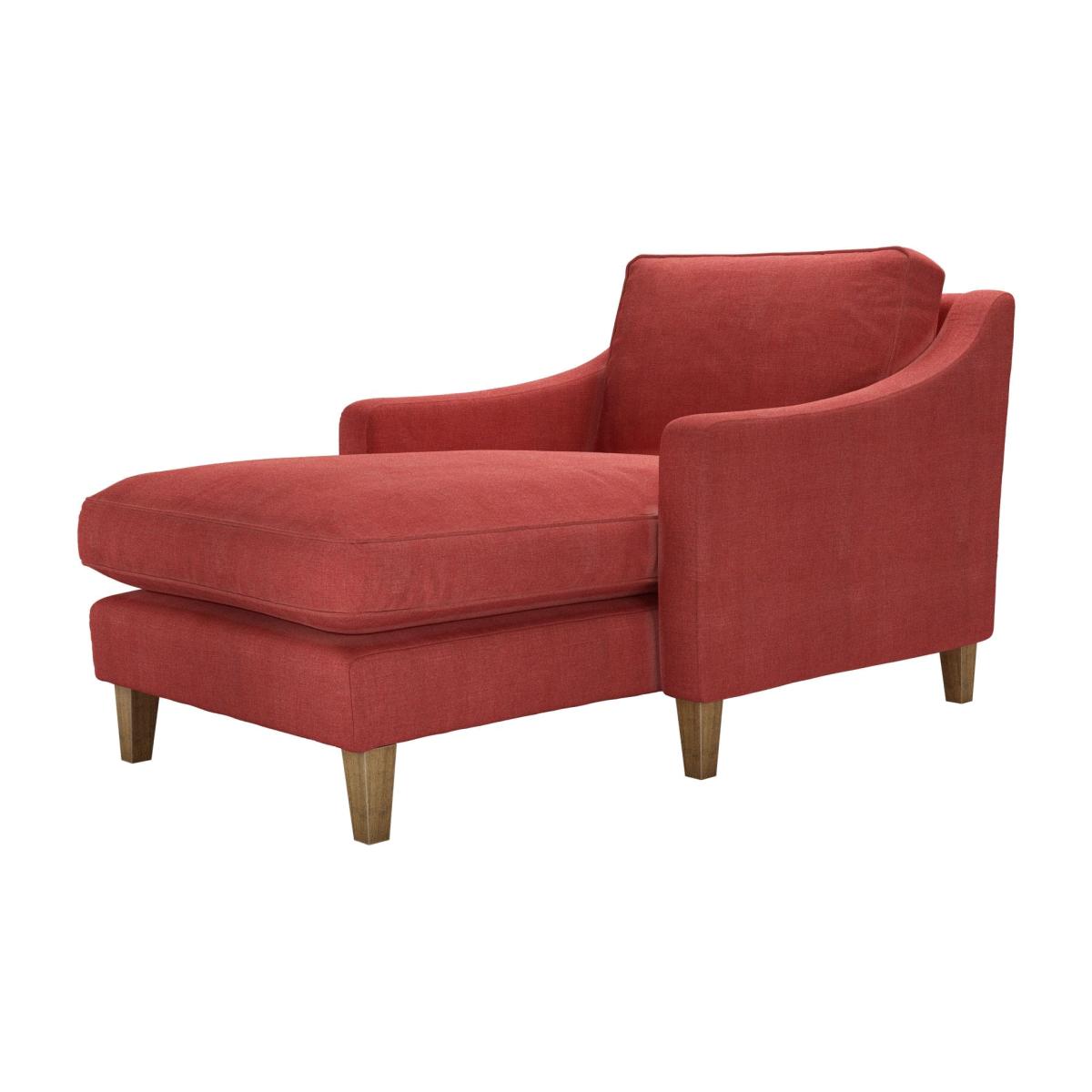 I love this chaise for its modern yet cosy appeal, making it a versatile addition to various interiors. Its warm Indian Summer cotton fabric offers a relaxed, inviting look perfect for living rooms or bedroom lounging areas. The shape lends itself well to contemporary spaces, but it can also soften more structured, minimalist interiors when styled with textured cushions or throws. Practical tips include pairing it with a neutral palette to let the colour pop, or mixing patterns for an eclectic vibe. It works particularly well as a statement piece in open-plan living areas, or next to a window to create a comfortable reading nook. Its sturdy wooden legs also ensure durability, making it both stylish and functional.