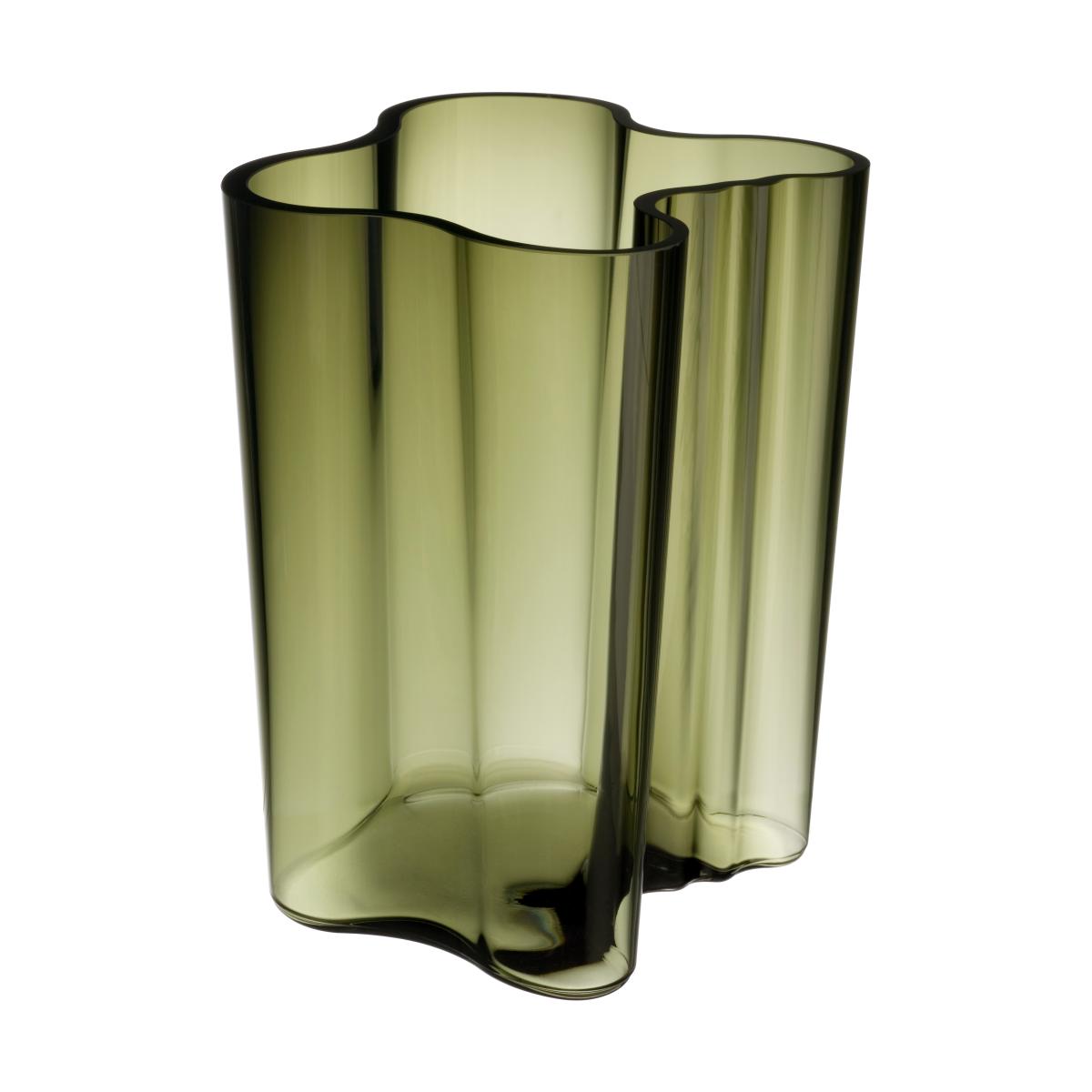 Display flowers in style with the Alvar Aalto vase in moss green from Iittala, designed by Alvar Aalto. This vase is an Iittala classic and a famous symbol of Scandinavian design. Launched in 1936, it is loved for its rolling shape, functional design and mouth-blown glass. The vase is available in several sizes and holds both bouquets, single flow stems or twigs, but it is also a wonderful sculpture when not filled.
