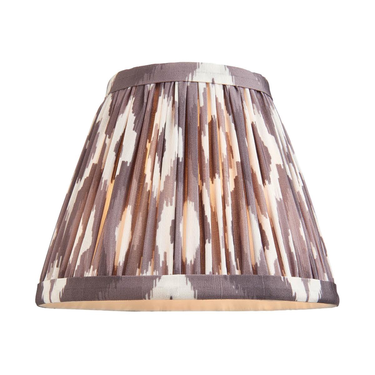 16cm tapered shade with clip gimbal to fit golf or candle bulbs. Unique Ikat pattern design in pearl grey with taped edge detailing and plain inner lining. Perfect when paired with one of our beautifully decorative table lights, wall lights, rechargeables or chandeliers.