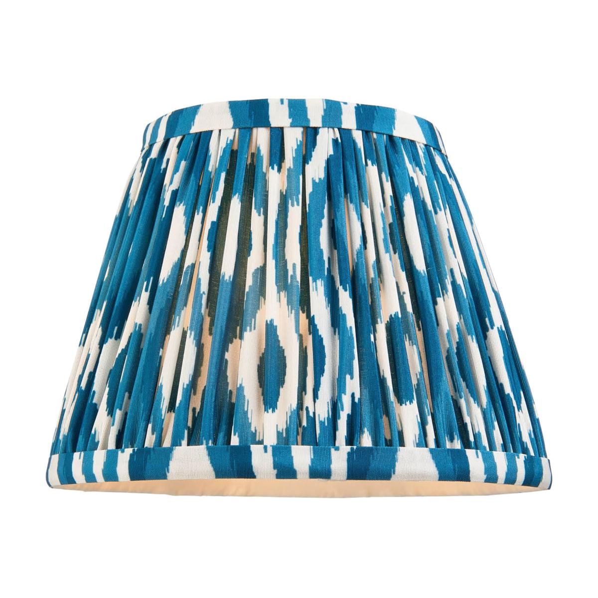 20cm tapered shade with white gimbal. Unique Ikat pattern design in marlin blue with taped edge detailing and plain inner lining. Perfect when paired with one of our beautifully decorative table lights, wall lights or chandeliers.