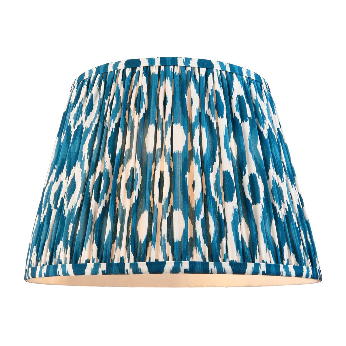 35cm tapered shade with reversible white gimbal. Unique Ikat pattern design in marlin blue with taped edge detailing and plain inner lining. Perfect when paired with one of our beautifully decorative table lights, floor lamps or cable sets.