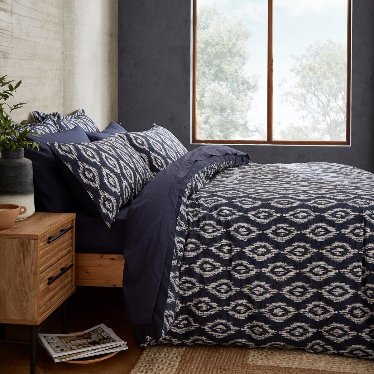I love this bedding set for its bold, graphic ikat pattern and the relaxed seersucker texture, which adds a subtle dimension and comfort. It works particularly well in contemporary or boho interiors, where its coastal and ethnic vibe can enhance a laid-back, stylish look. Practical styling tips include layering with neutral or solid-coloured cushions to balance the pattern, or pairing it with natural textures like wicker or linen. The deep navy tone makes it versatile for both modern and more traditional spaces, and the crisp pattern can easily be mixed and matched with other prints for an eclectic scheme. Overall, it’s a smart choice for anyone looking to add visual interest to their bedroom while maintaining a refined aesthetic.