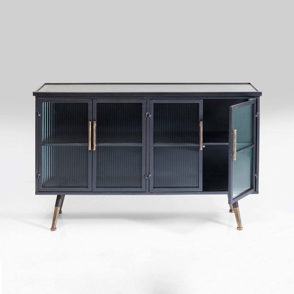 An industrial-inspired, four-door sideboard with ribbed glass doors and a powder-coated steel frame. Light distressing on handles and edges give this piece a much-loved feel.