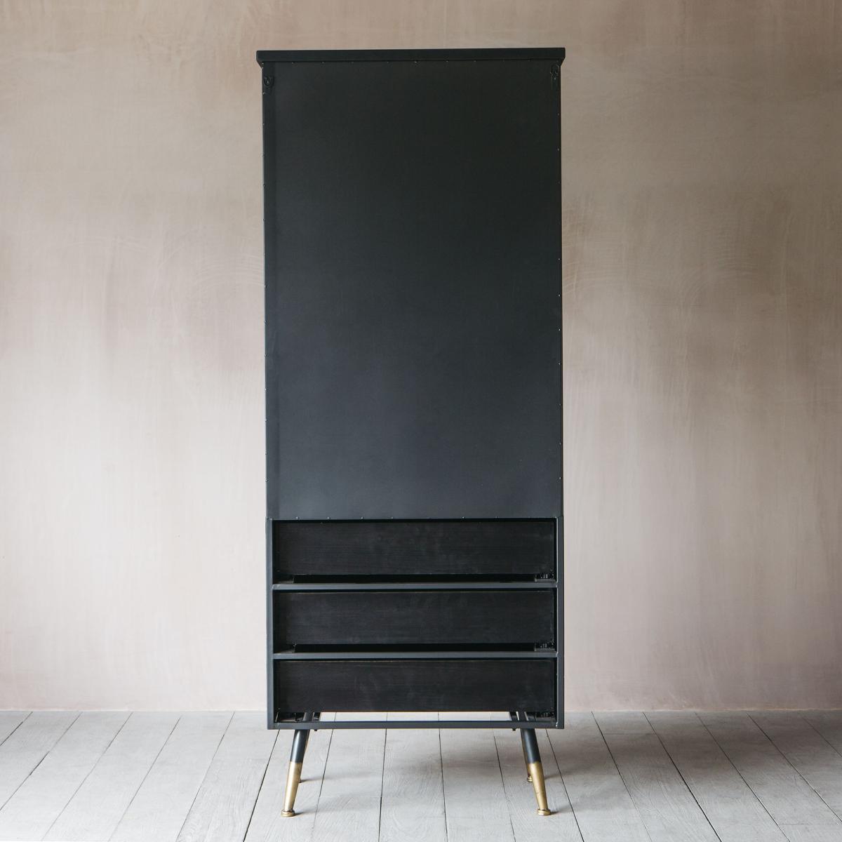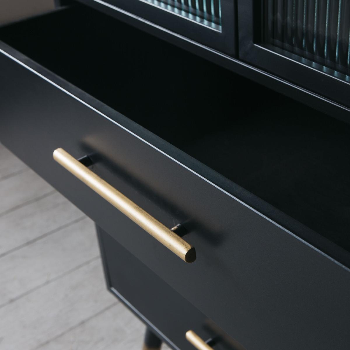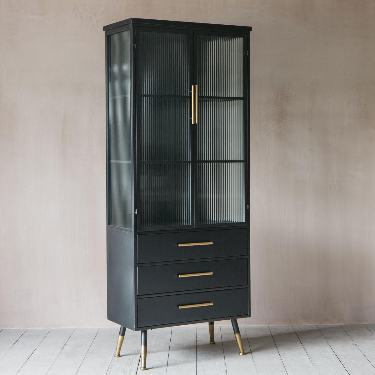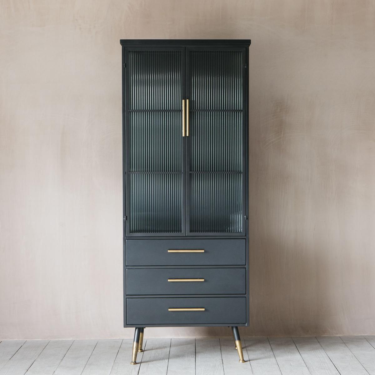 With an industrial feel, our Ike cabinet is perfect for displaying your curated finds. Featuring three shelves behind grooved glass doors and three lower drawers finished with lightly distressed brass-effect handles and matching brass tipped feet.