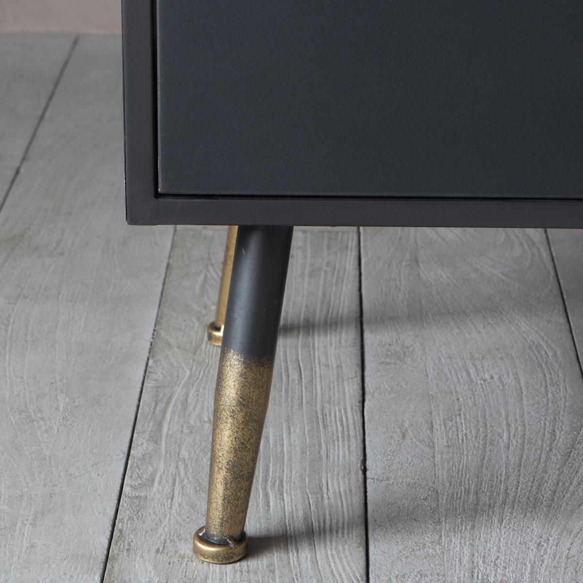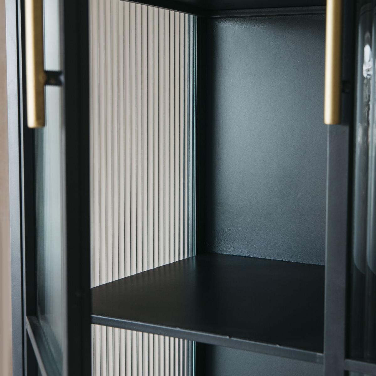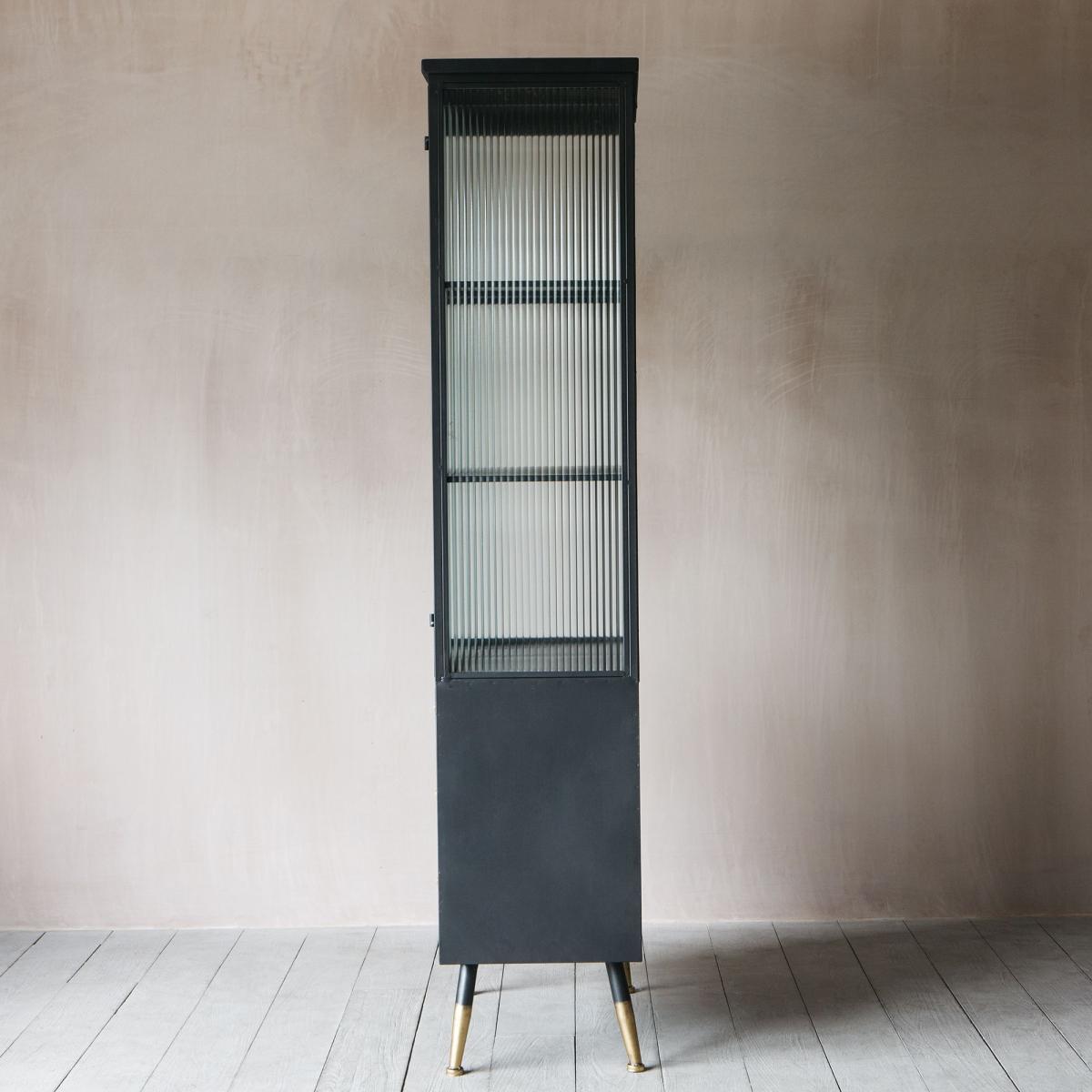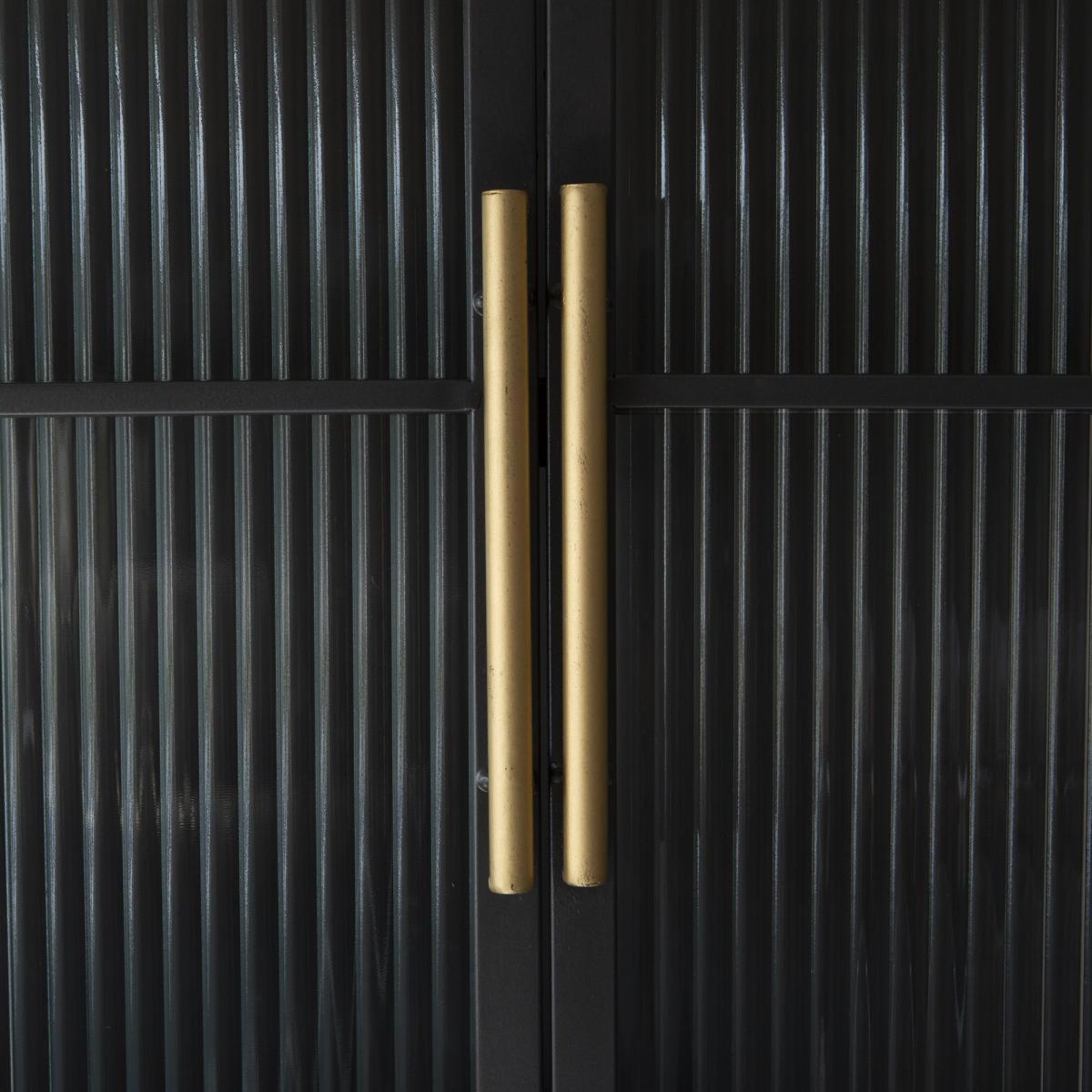With an industrial feel, our Ike cabinet is perfect for displaying your curated finds. Featuring three shelves behind grooved glass doors and three lower drawers finished with lightly distressed brass-effect handles and matching brass tipped feet.
