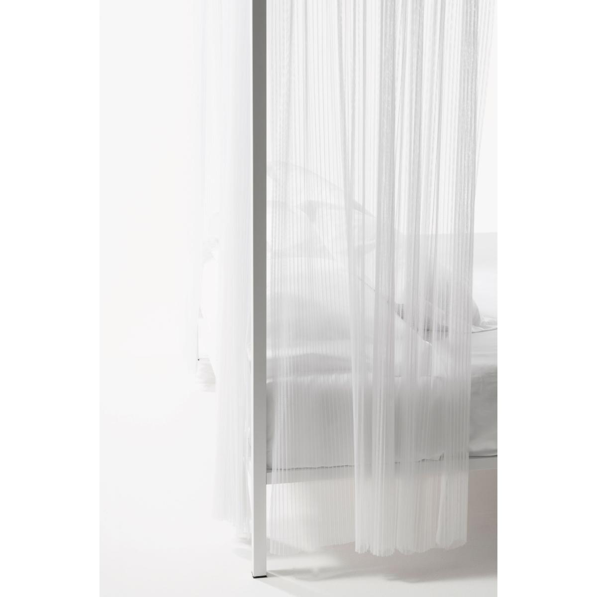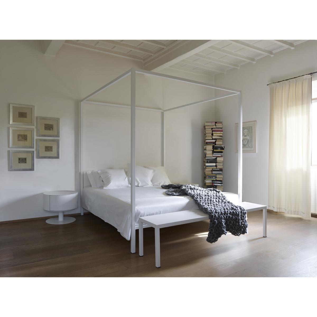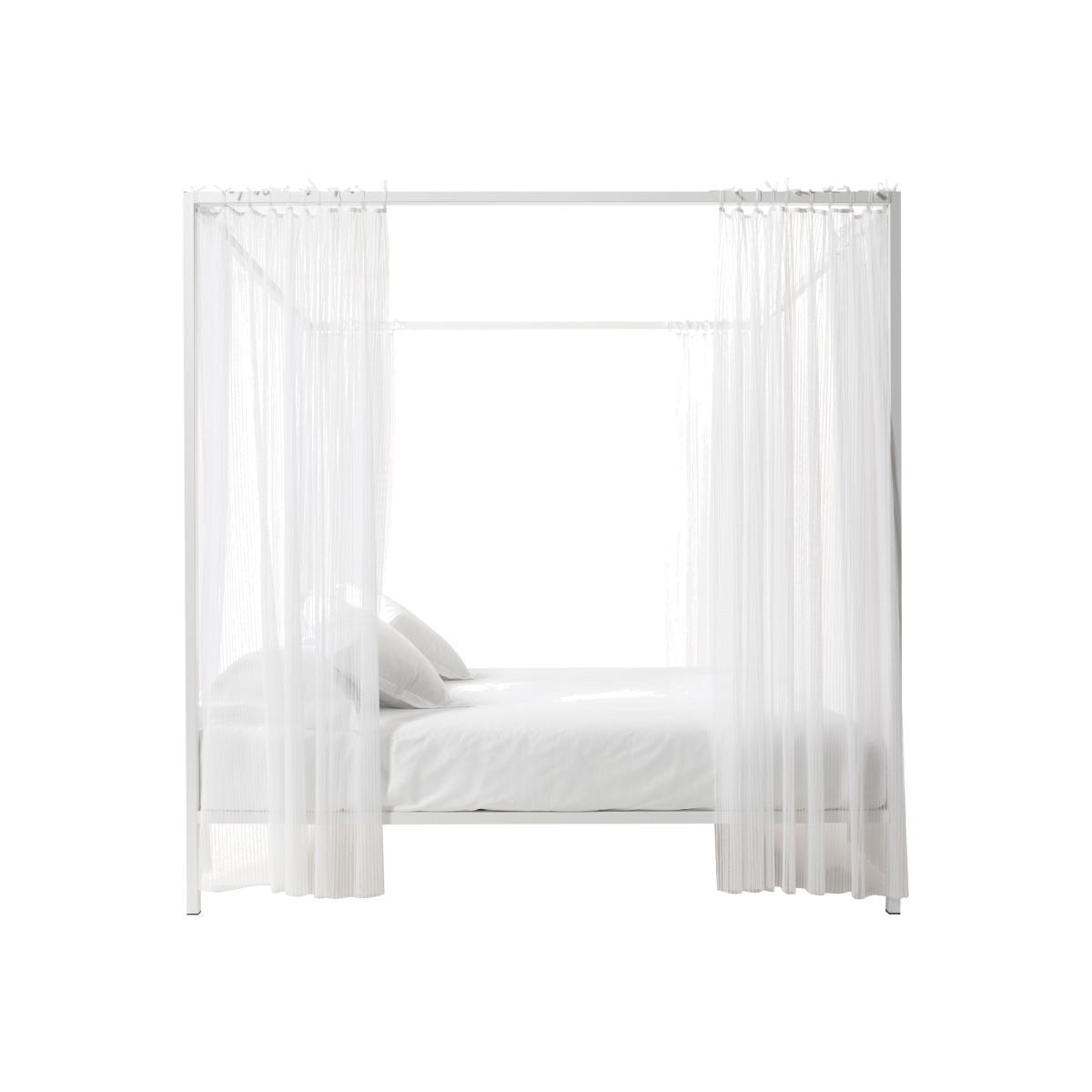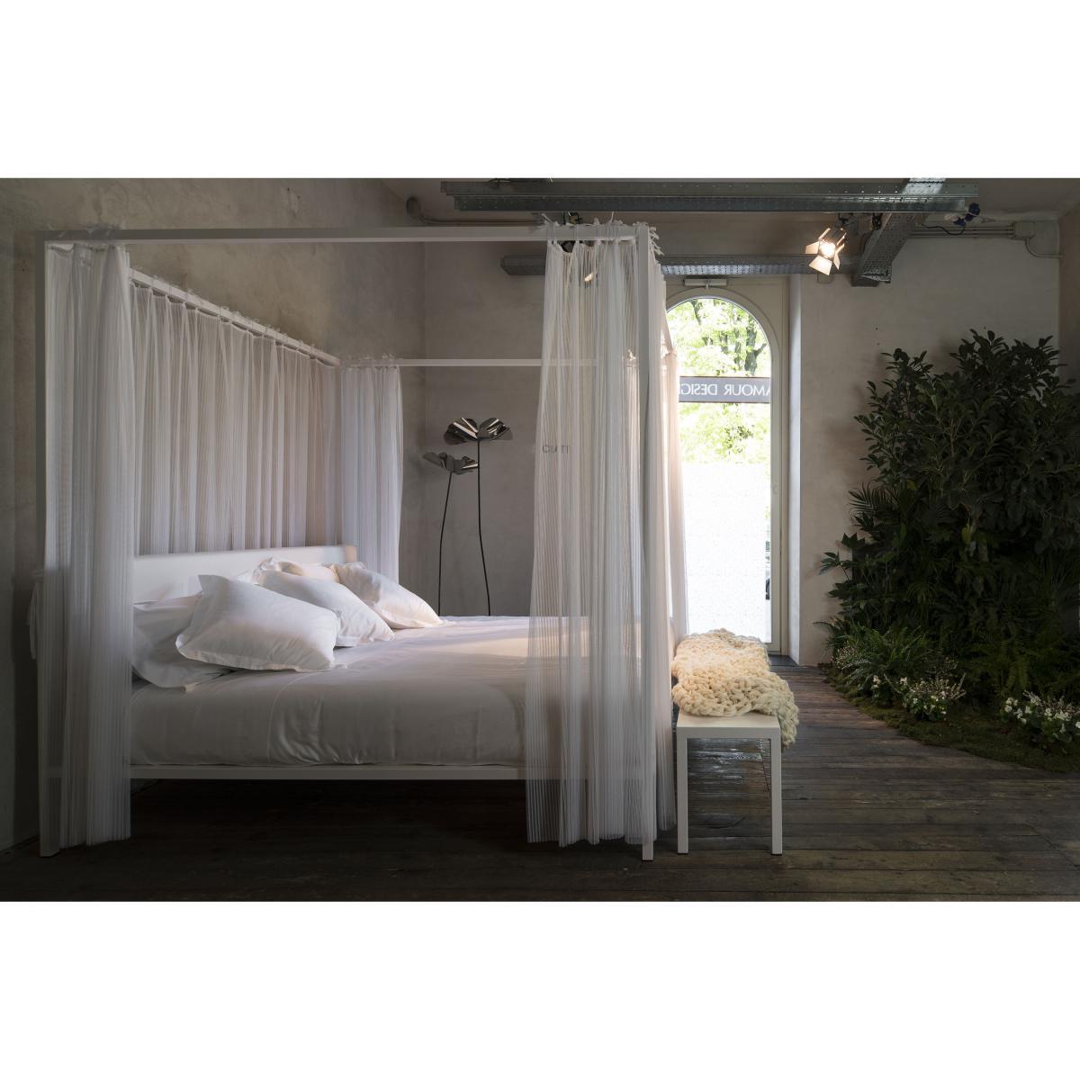 A classic revisited. A modern four poster bed, minimalist, with geometric lines. Its fine, sleek structure in white steel is very aerial. It is decorated with four white tulle hand pleated curtains, signed by Italian designer Maurizio Galante. The net curtains play with the transparency of the structure, light, poetic and romantic. They are highly decorative and create an intimate style. You can create an intimate area by playing with the layout of the curtains(not included). The Illetto four poster bed is a majestic piece that will lend style and class to your bedroom. This four poster bed is designed for a 180 x 210 cm mattress (not included). It comes with a natural birch slot bed base. The light is not included, it is sold separately (contact us).