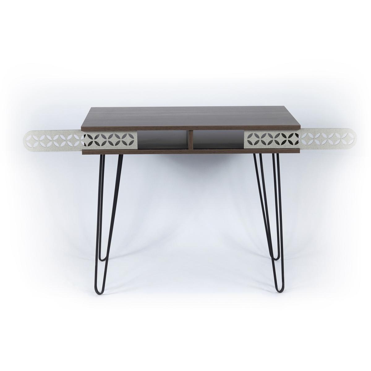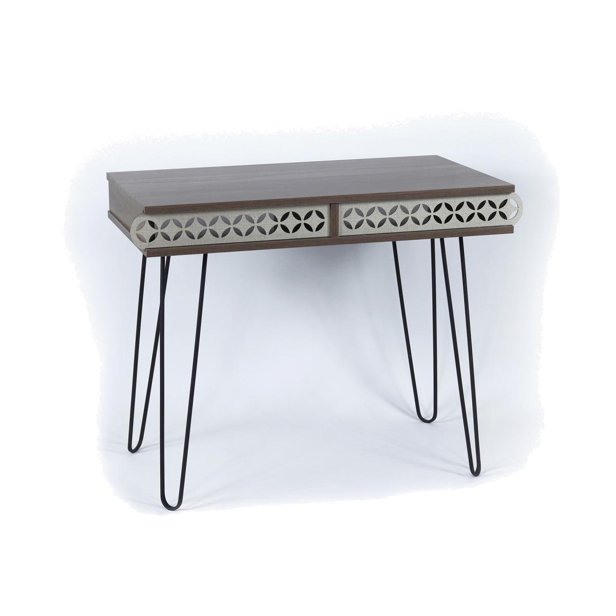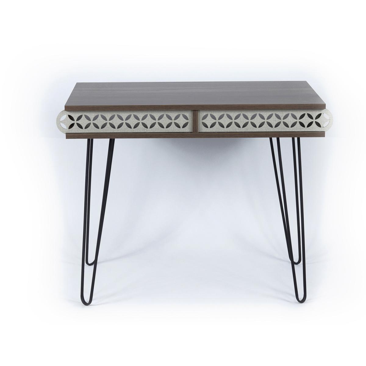 Space-saving is a breeze with this compact desk that is sized for small homes, apartments. Featuring a modern, wide-open design, this desk finished in a walnut wood look is equally functional as a computer desk or writing table. The table-top is perfect for a laptop tablet, a lamp, a notebook to get the job done.