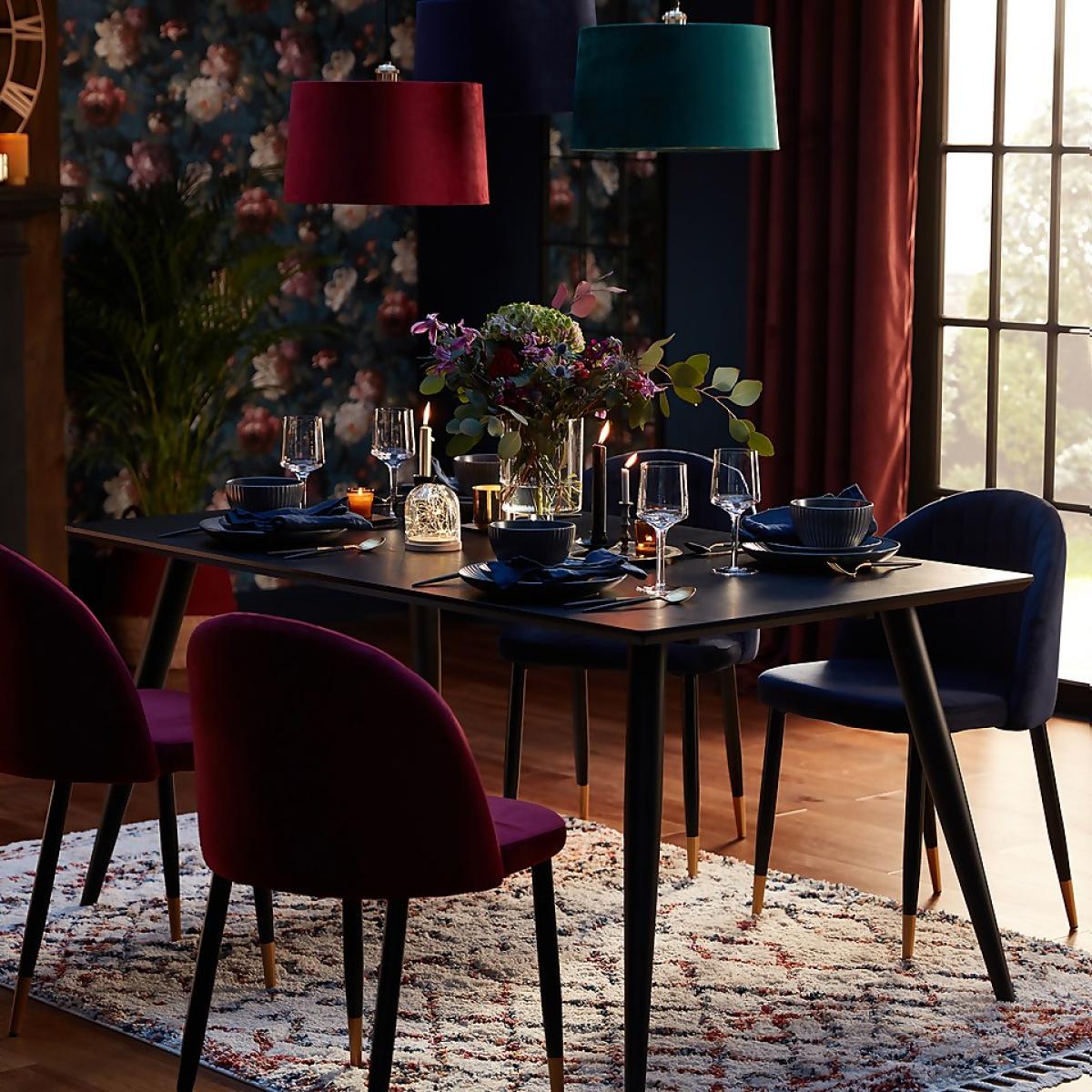 Go glam in the dining room with Illona. Full of charisma, the Illona dining table offers a contemporary chic style for your home. It boasts a wonderful black ash top with a Swiss edge chamfer to give this table edge. This combined with its striking splayed legs and dramatic black finish give Illona its bold personality. Host a lavish dinner party or enjoy evening drinks with friends at this sleek number.
