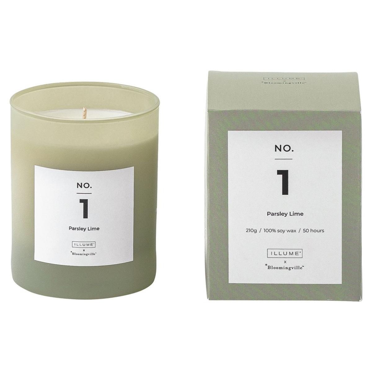 The No. 1 Parsley Lime Scented Candle by ILLUME x Bloomingville brings freshness to your home! The scented candle is made from natural wax and comes in a beautiful matte glass container in a dusty green color. Infused with the refreshing scents of lemon, parsley, and lime, this scented candle will add a delightful freshness to any space. Whether it's in your bathroom, living room, or bedroom, this candle will help create a relaxing and welcoming atmosphere. The scented candle comes in a beautiful gift box - perfect for any occasion. Its carefully crafted blend of floral and bergamot scents creates a truly distinct and soothing aroma that sets it apart from other scented candles. Parsley Lime scent. Soy wax. Approximate burn time 50 hours. Size H10,. Diameter 8cm.