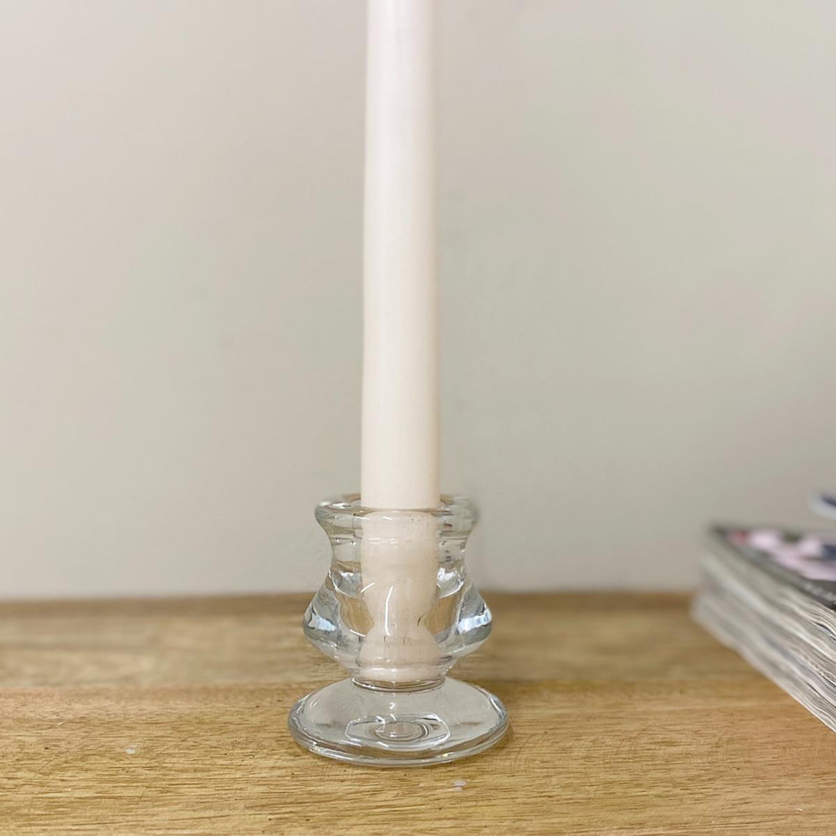 A Clear glass taper candle holder suitable for candles with a maximum diameter of 2cm. This item is plain but stylish and is easy to clean and durable for long-term use.