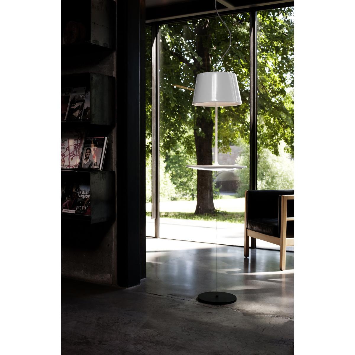 Illusion combines the functional elements of light and a table. It hovers above the ground, challenging our perceptions of gravity and our idea of two common pieces of furniture, offering the elements of surprise and magic. Combined in one, the lamp and table become the focal point of any space, whilst providing a place for your cocktail or your keys. The shiny white version of Illusion releases a strong and clear light down from the shade element, while the matt black version emits a more sparse and diffused light. Illusion was inspired by the wonders of the Scandinavian natural landscape. In particular Kjæragbolten, a large rock hovering in the crevice of a mountain above Lysefjorden in Rogaland, Norway.