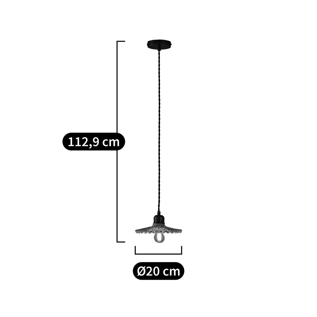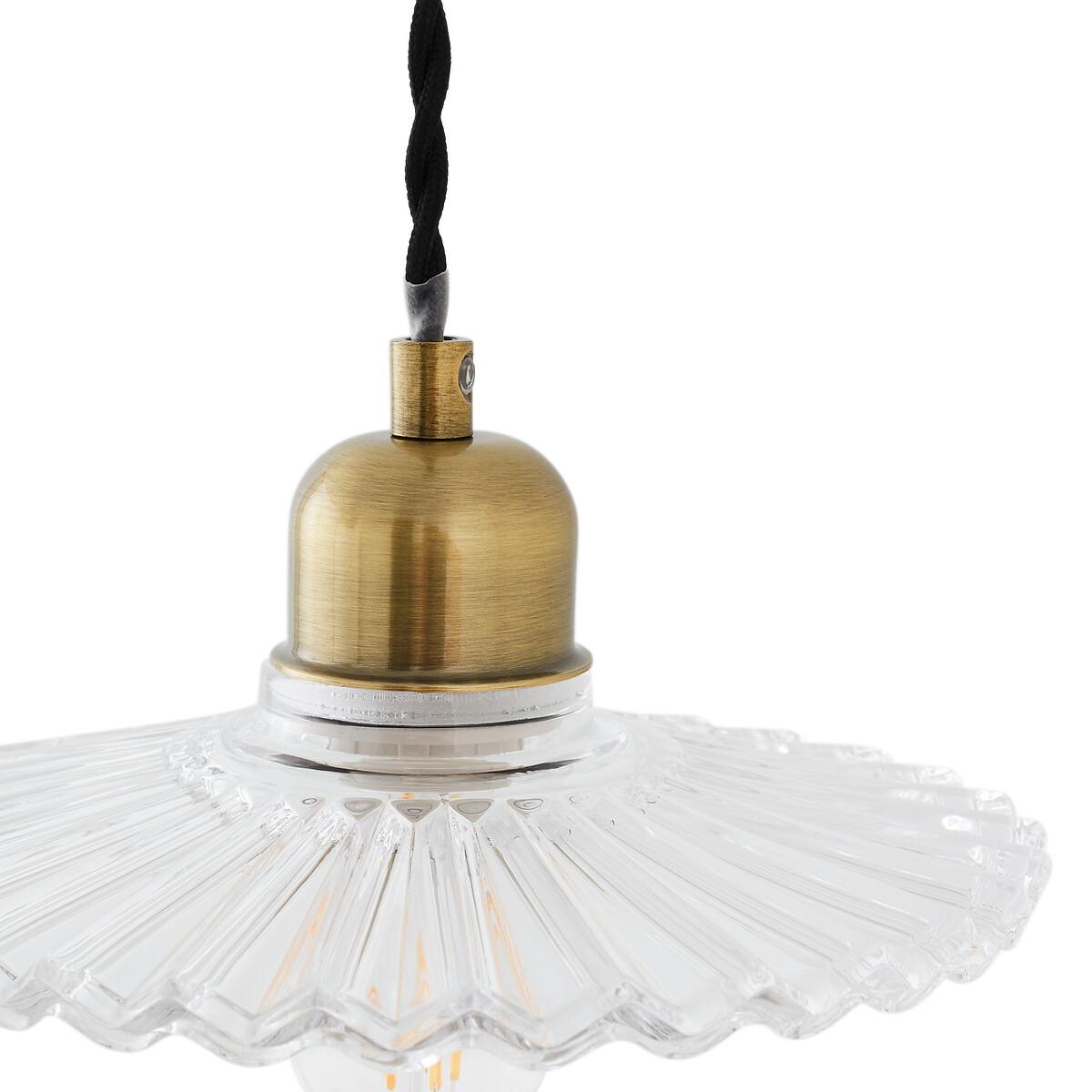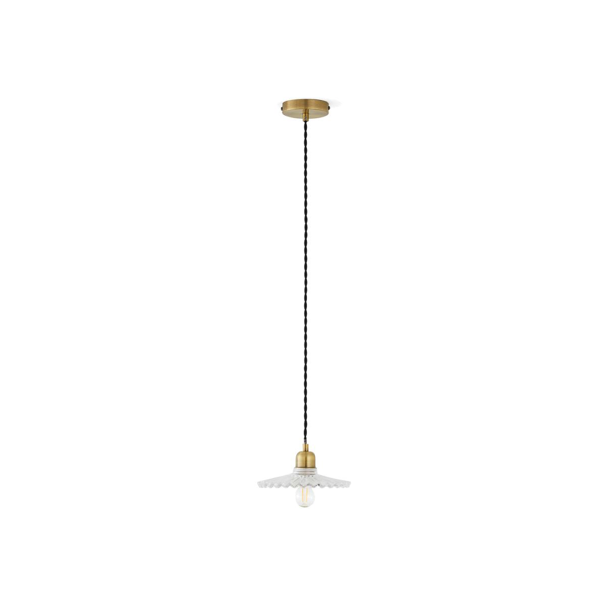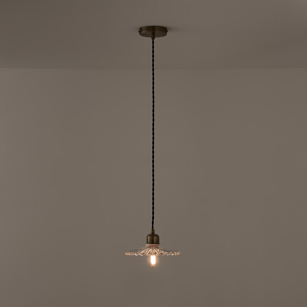 This vintage-inspired ceiling light is crafted from bright brass and textured glass and diffuses the light beautifully around your room. Product Details • Shade in ribbed glass • Brushed brass finish iron base and socket support • Twisted fabric cable • E14 socket for LED bulb of 4W max (not supplied)Dimensions • Diameter: 20cm • Total Height: 112.9cm • Lampshade:Diameter 20 x H4.2cm. Dimensions and weight of parcel1 parcel • L26 x H26.5 x D17.5cm. 1kg.