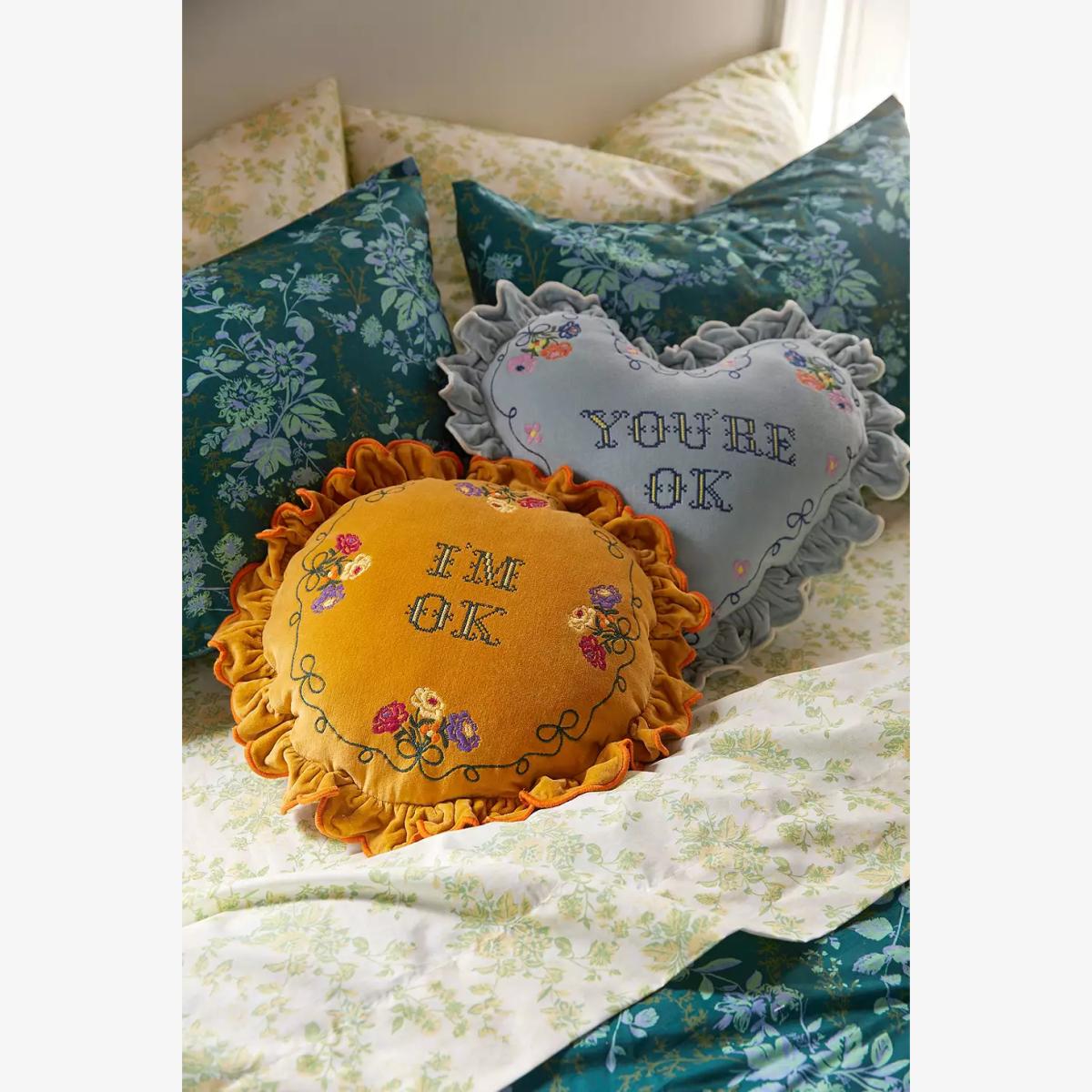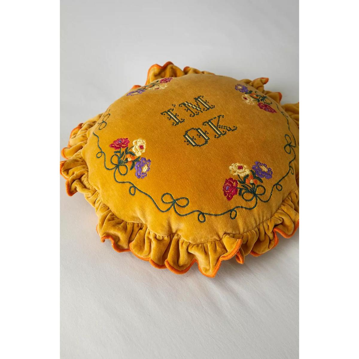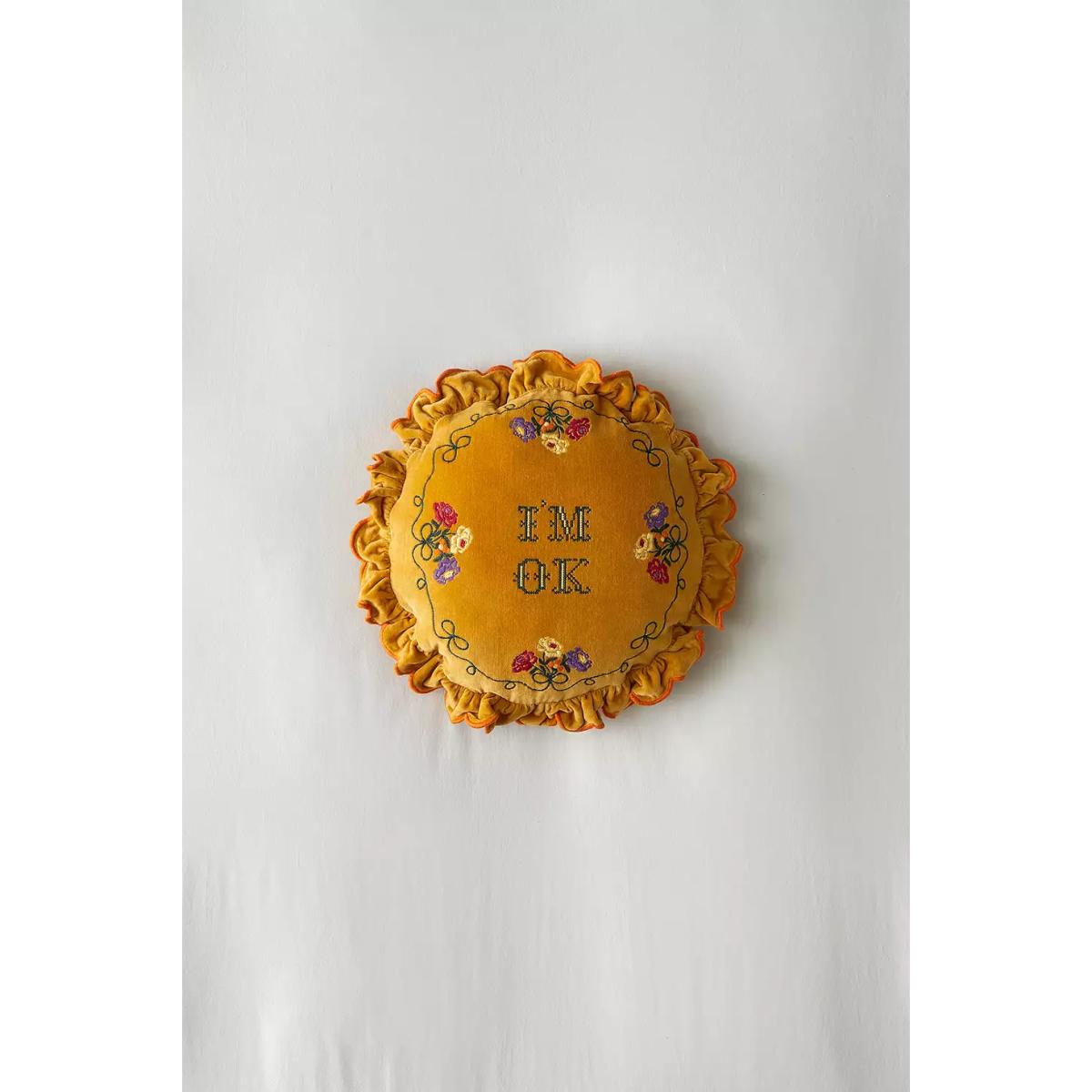 Add a vintage touch to your space with this plush cushion. Crafted from a velvet fabrication in a rounded silhouette complete with a ruffle hem and cross-stitch design. Topped with an 'I'm Ok' motif to front. **Content + Care** \- Main: 100% Cotton \- Filling: 100% Polyester