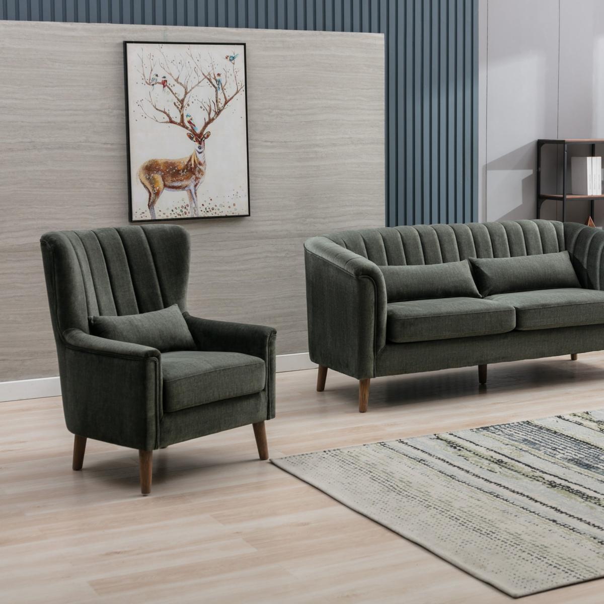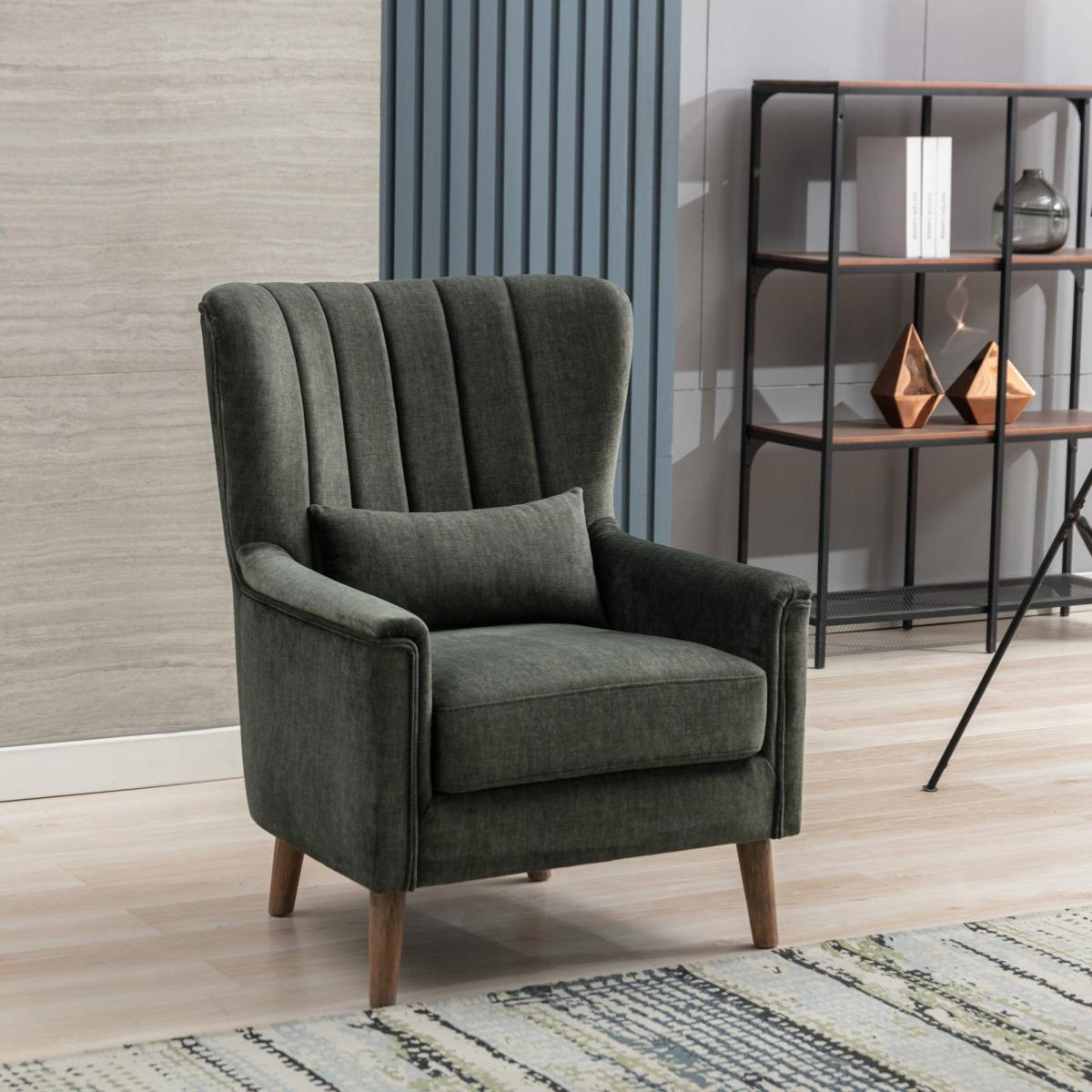 * Premium velvet fabric * Sturdy wooden legs * Chesterfield style Refined yet inviting, this wingback chair offers a timeless look with a contemporary finish. Wrapped in plush velvet upholstery, it provides a sumptuously soft texture while maintaining a structured silhouette. The generously padded seat ensures comfort, and the sturdy wooden legs add both stability and a touch of classic charm.