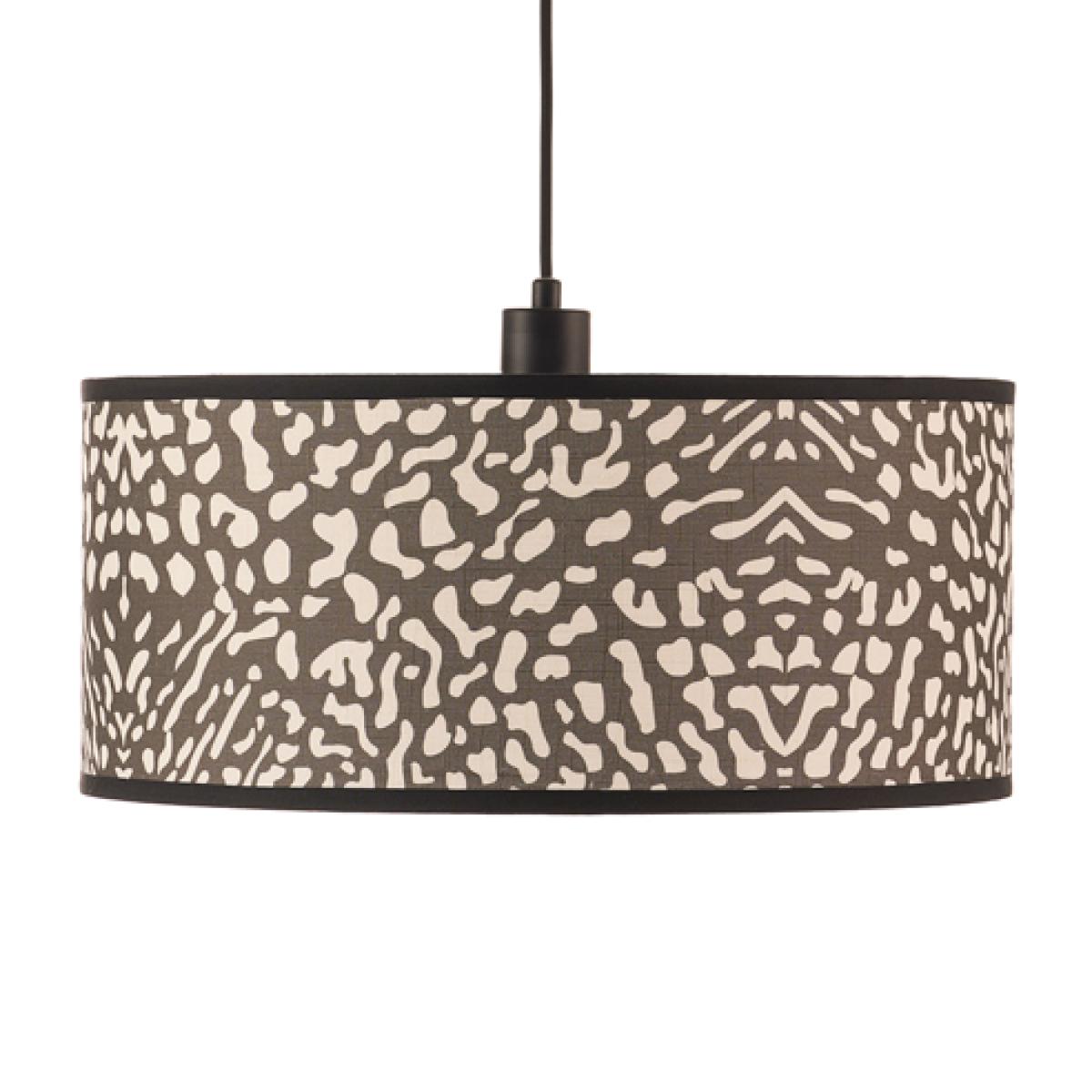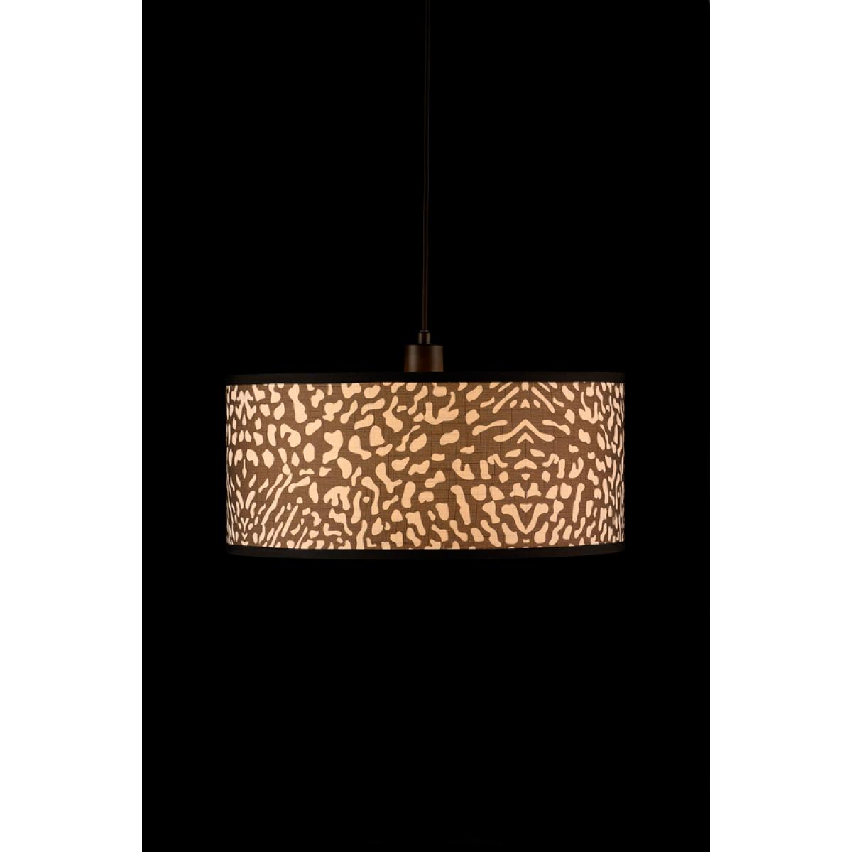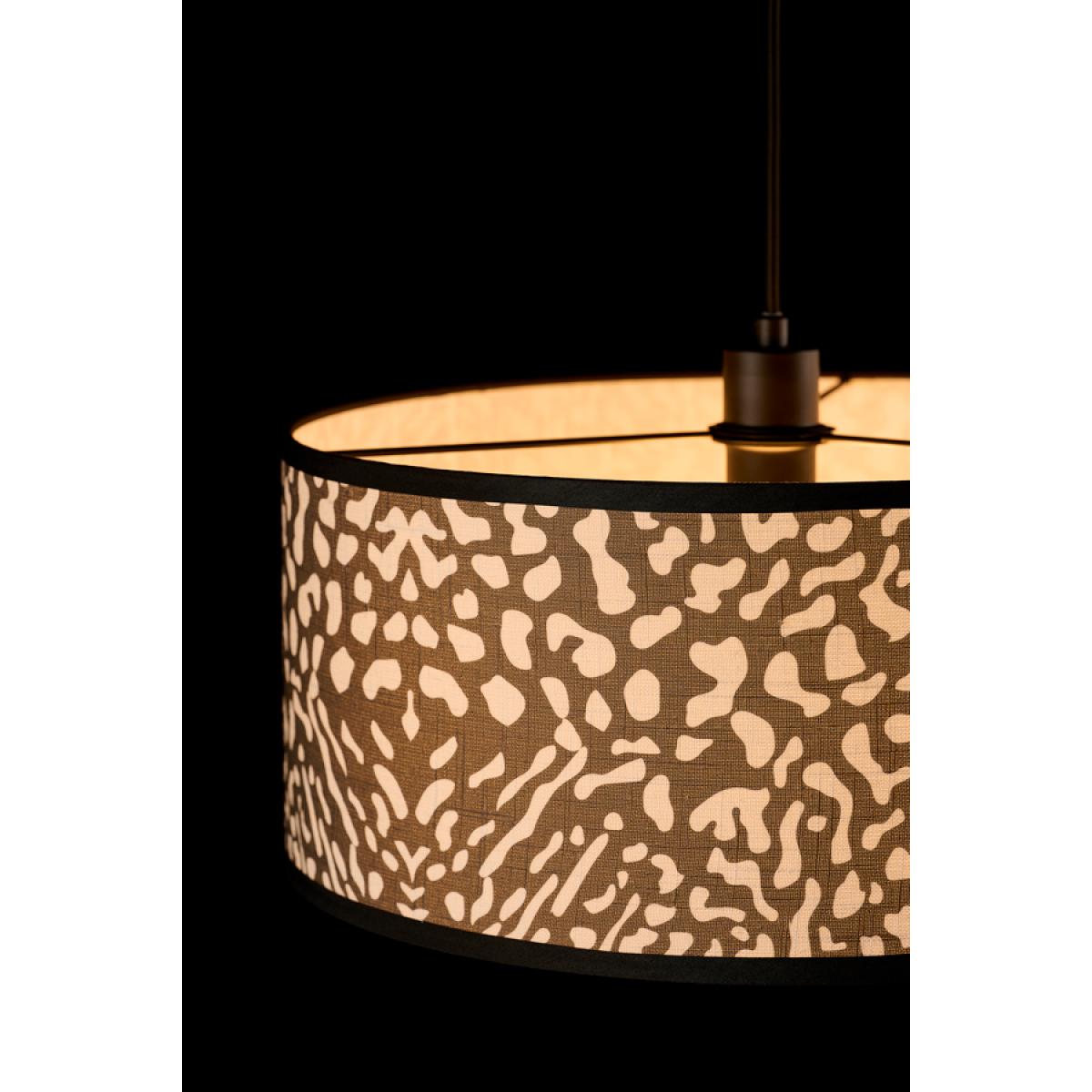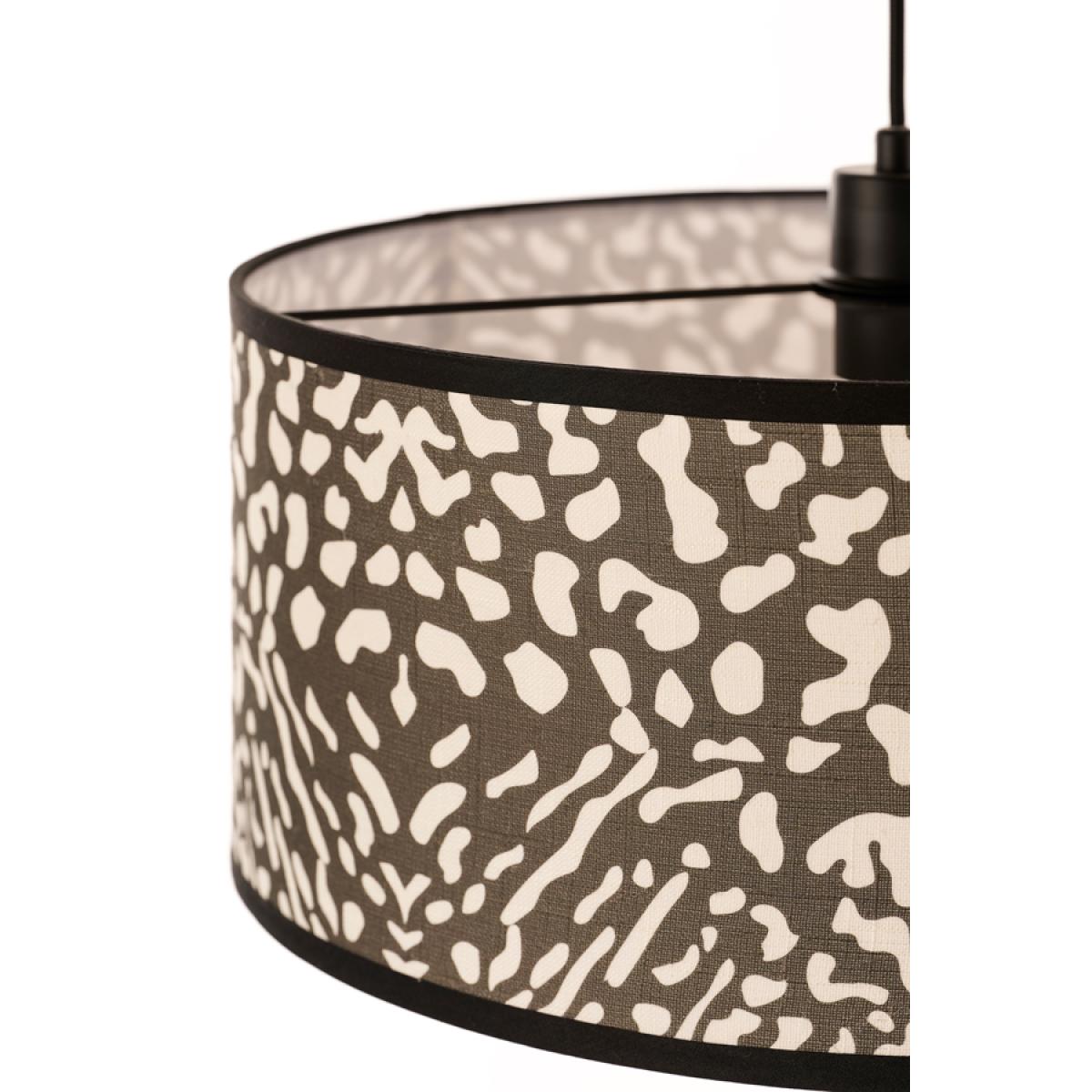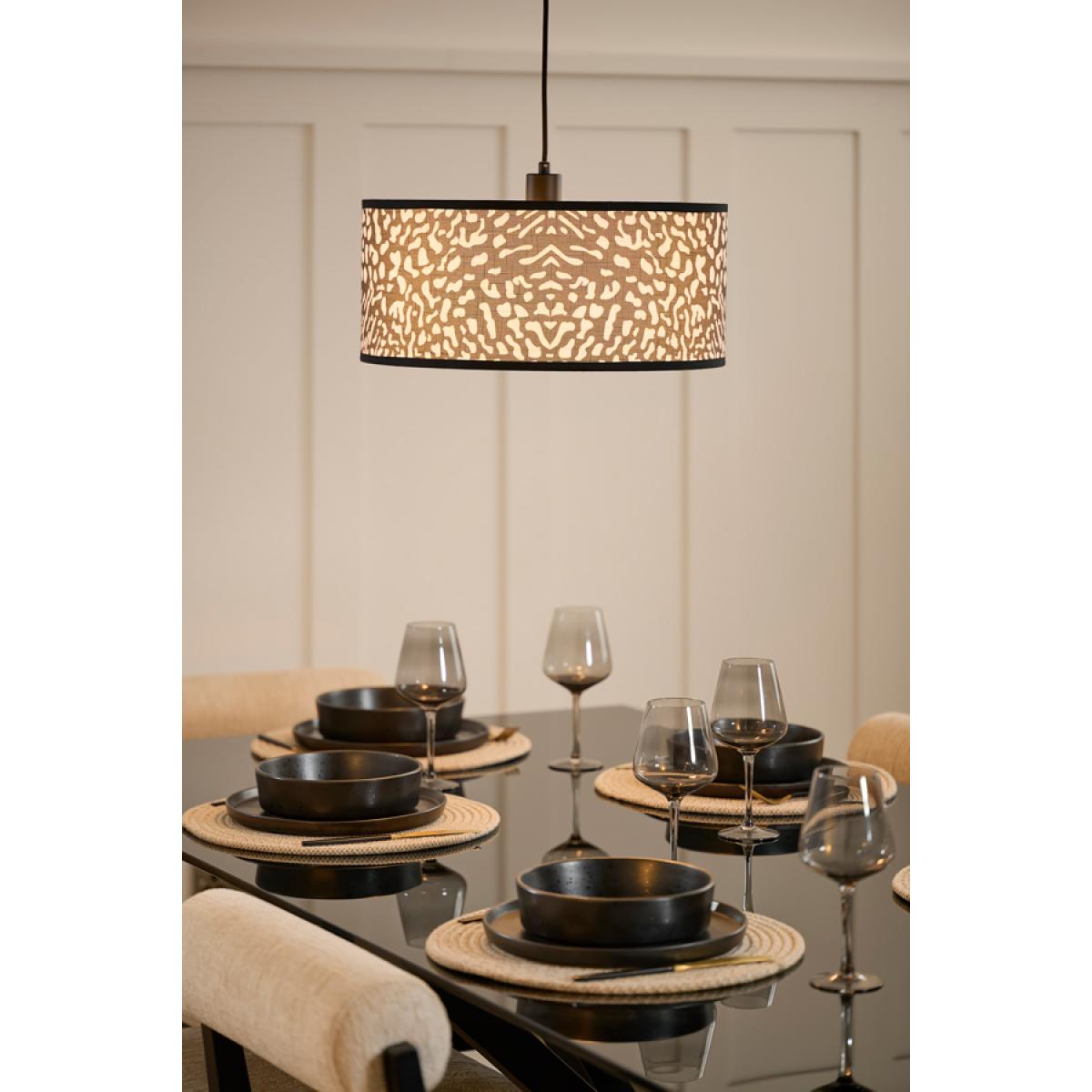 Contemporary light fitting featuring a drum shade with an abstract printed design and neat black edging tape. Black woven cable. Matt black metal ceiling rose and bulb holder. Supplied complete with E27 40W globe bulb. Height adjustable prior to installation.