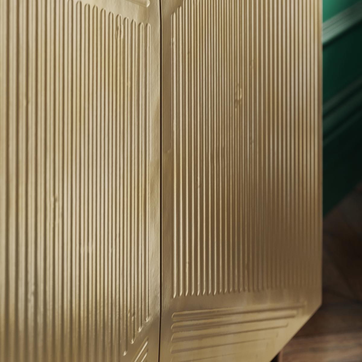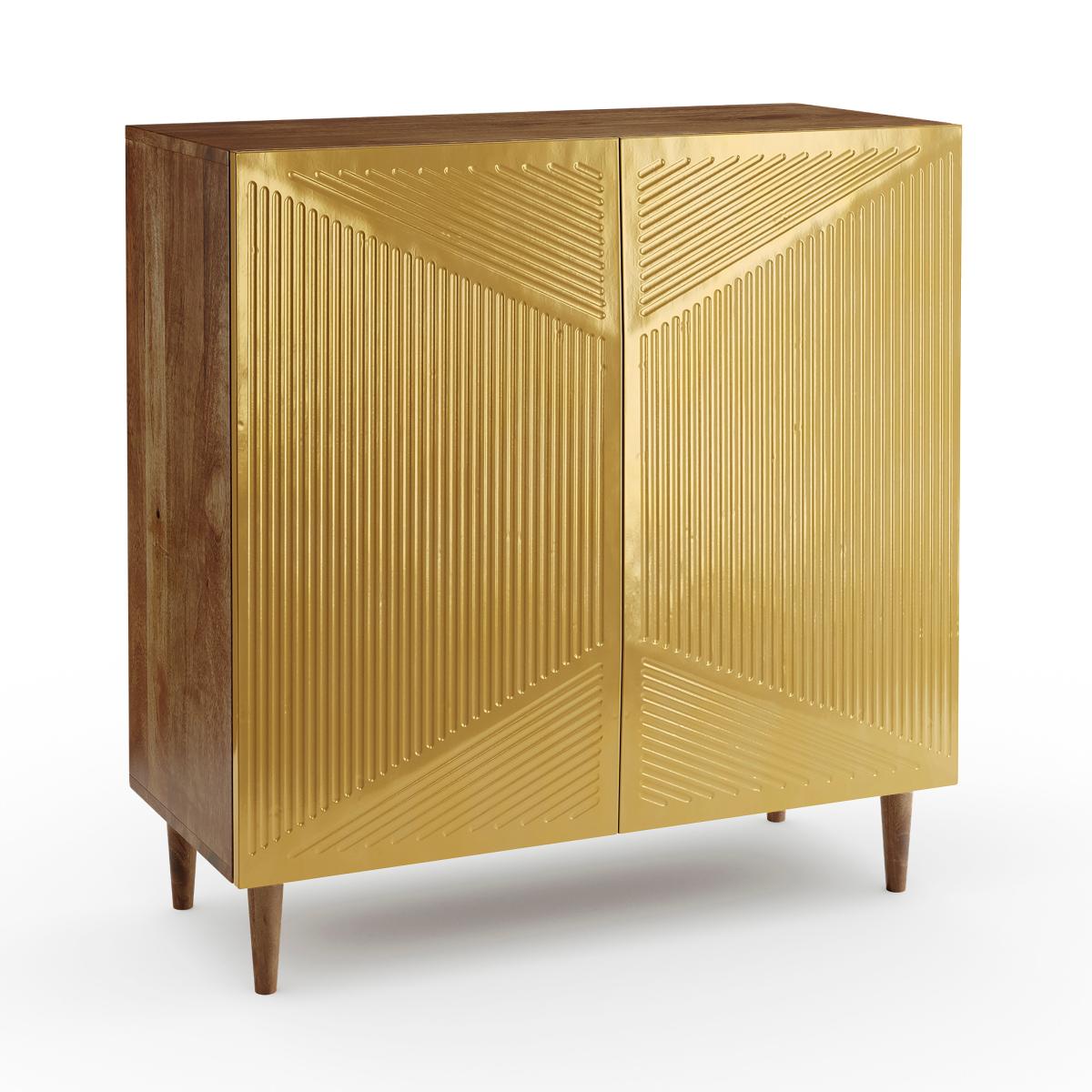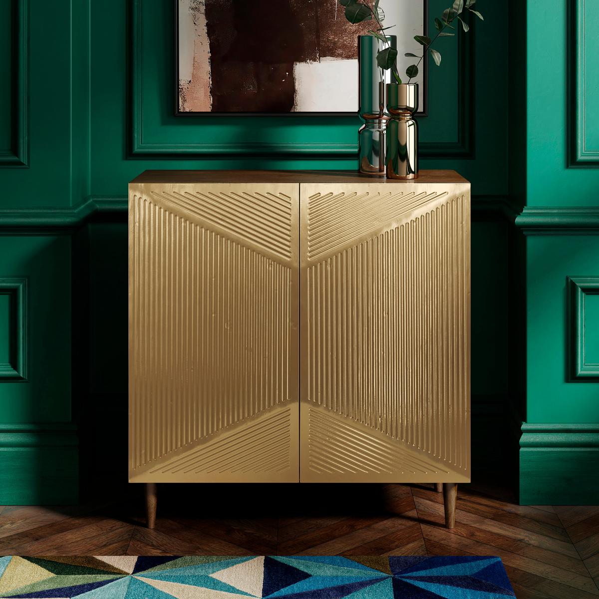 Crafted with a sturdy mango wood frame, this sideboard is adorned with brass sheet metal, resulting in a dazzling geometric pattern on its doors. Whether you place it in your dining room or hallway, it not only offers ample storage space but also serves as a captivating centrepiece. The charm of this piece lies in its unique character, as variations in the brass sheet metal's tone and application make each sideboard a one-of-a-kind addition to your home.