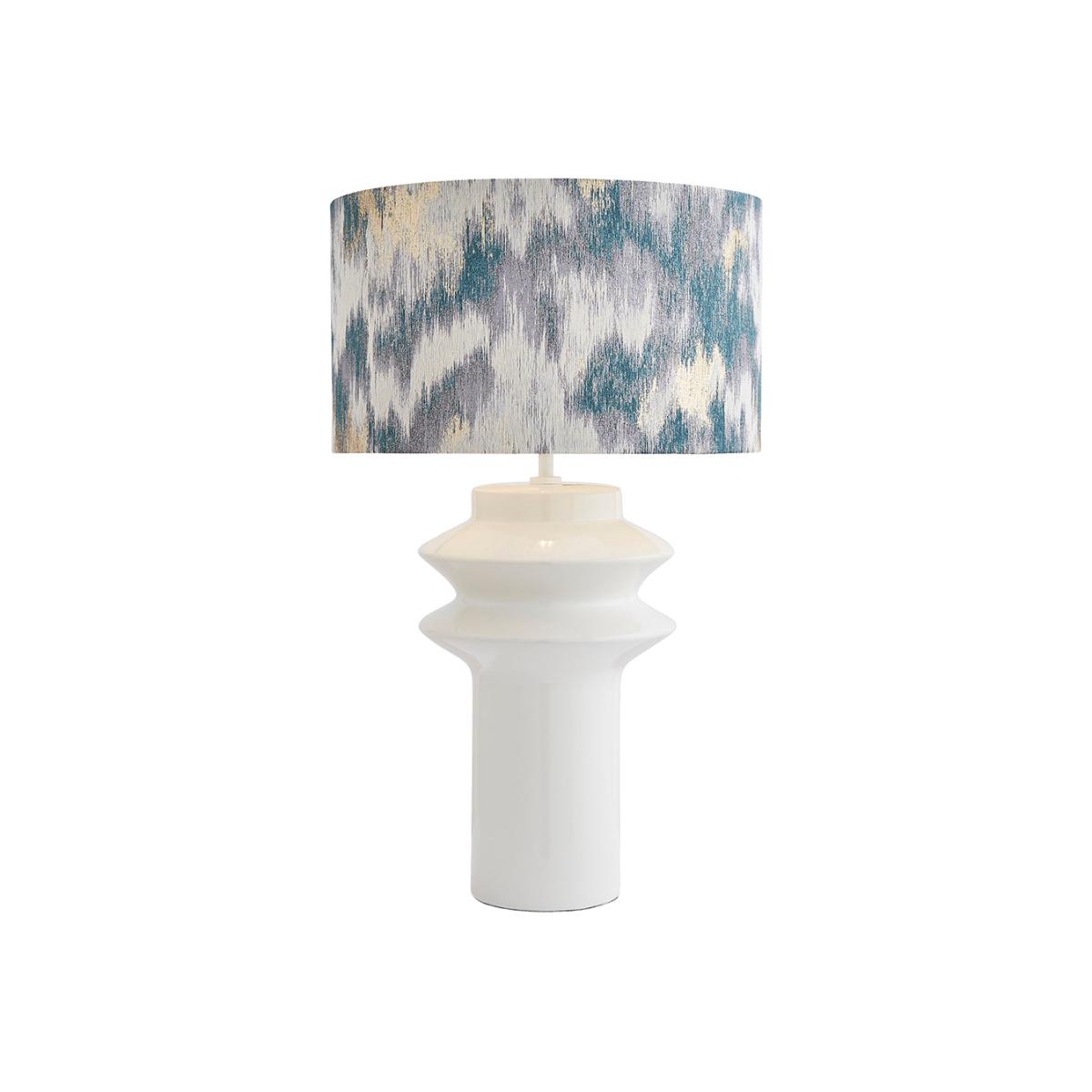 Bring elegance and texture to your home with the Imara White Shaded Table Lamp, a stunning Pagazzi Design exclusive that combines soft tones, luxurious finishes, and contemporary craftsmanship. The lamp features a white gloss glaze ceramic base with smooth contours and a sculptural form that adds a modern touch to any interior. Perfectly paired with a 35cm cylindrical shade, it’s dressed in a woven fabric that showcases a blue and natural pattern with subtle metallic threads, giving it a sophisticated shimmer when illuminated. Designed with versatility in mind, the Imara lamp fits beautifully into living rooms, bedrooms, or hallways, creating a warm and stylish atmosphere. The lamp is equipped with a 3-way fixed gimble for stability, an in-line switch for easy use, and is double insulated for added safety.