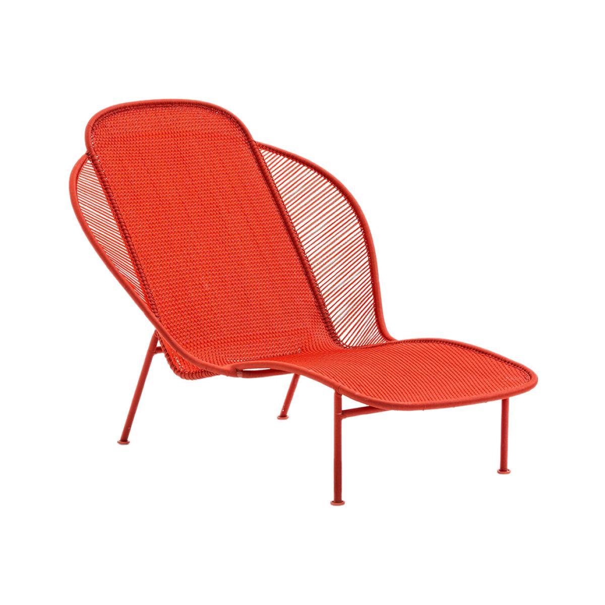 "An ethnic style livened up with flashy, contemporary, cheerful colours. As part of the “M'Afrique” project, Patrizia Moroso (artistic director of the eponymous brand) invited artists (designers, architects, photographers) to convey the strength and beauty of Africa through their works. Designers Frederica Capitani, Sebastian Herkner, Patricia Urquiola and Tord Boontje took up the challenge by creating a collection of outdoor furniture inspired by the creative language and culture of Africa. The result is staggering: this collection is at once exuberant, rich in humanity, baroque, colourful and full of vitality. A delight for the eyes and an invitation to travel. M'Afrique is a perfect synthesis between tradition and modernity: each piece of the collection is handmade by local craftsmen in a Senegalese workshop created by Moroso. The Imba sun lounger is made of coloured polyethylene threads, hand-woven on a tubular structure in lacquered steel. The braiding technique used is traditionally found in Africa to make fishing nets. A remarkable piece of craftsmanship that makes each M'Afrique creation a unique piece. This creation's DNA consists of tradition and modernity, innovation and history and form and beauty all at once. Suitable for both outdoor and indoor use. PLEASE NOTE. The pieces in the M'Afrique collection are entirely made by hand. Each item is unique. Any slight variations in colour and braiding should not be considered defects. ".