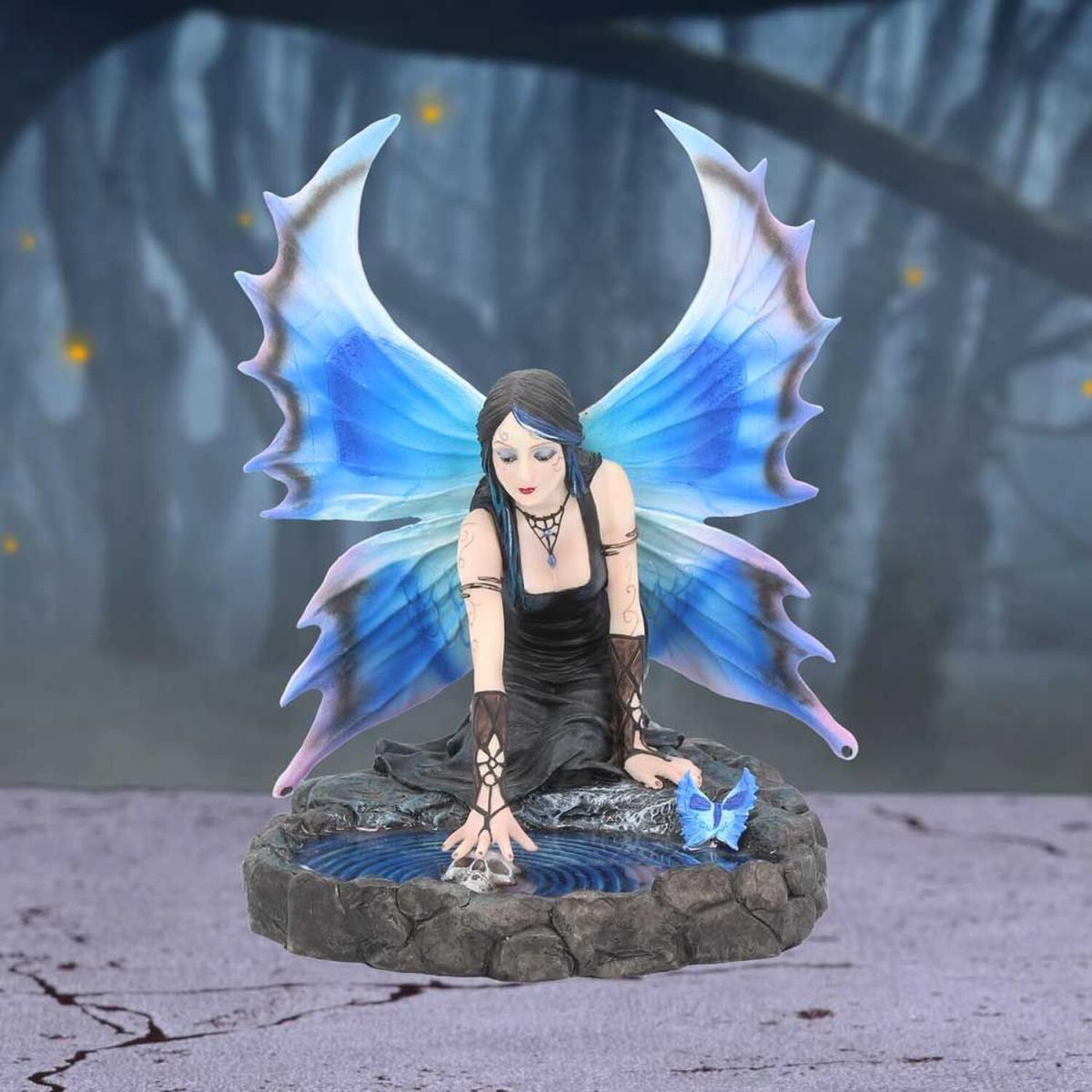 From Fantasy brand Nemesis Now's giftware collection, this alternative Fairy figurine comes from the Gothic imagination of world-famous Fantasy artist Anne Stokes. In an enchanted forest at night, a young Fairy kneels in front of a still pool as the moon shines through the trees. Her blue and purple wings are unfurled behind her, matching the blue butterflies that flitter around. Her green dress is sleeveless, exposing her Celtic tattoos and silver torcs above the fingerless leather gloves she wears. Her straight black hair has blue streaks through it and hangs down as she reaches out to a human skeleton, barely submerged in the pond. Light shines from her hand as ripples spread outwards from whatever dark magic she's performing, and if her wings are inspected closely a large death's head is visible. Cast in the finest resin before being expertly hand-painted, this enchanted figurine is a great way to add a delicious touch of darkness to your home.