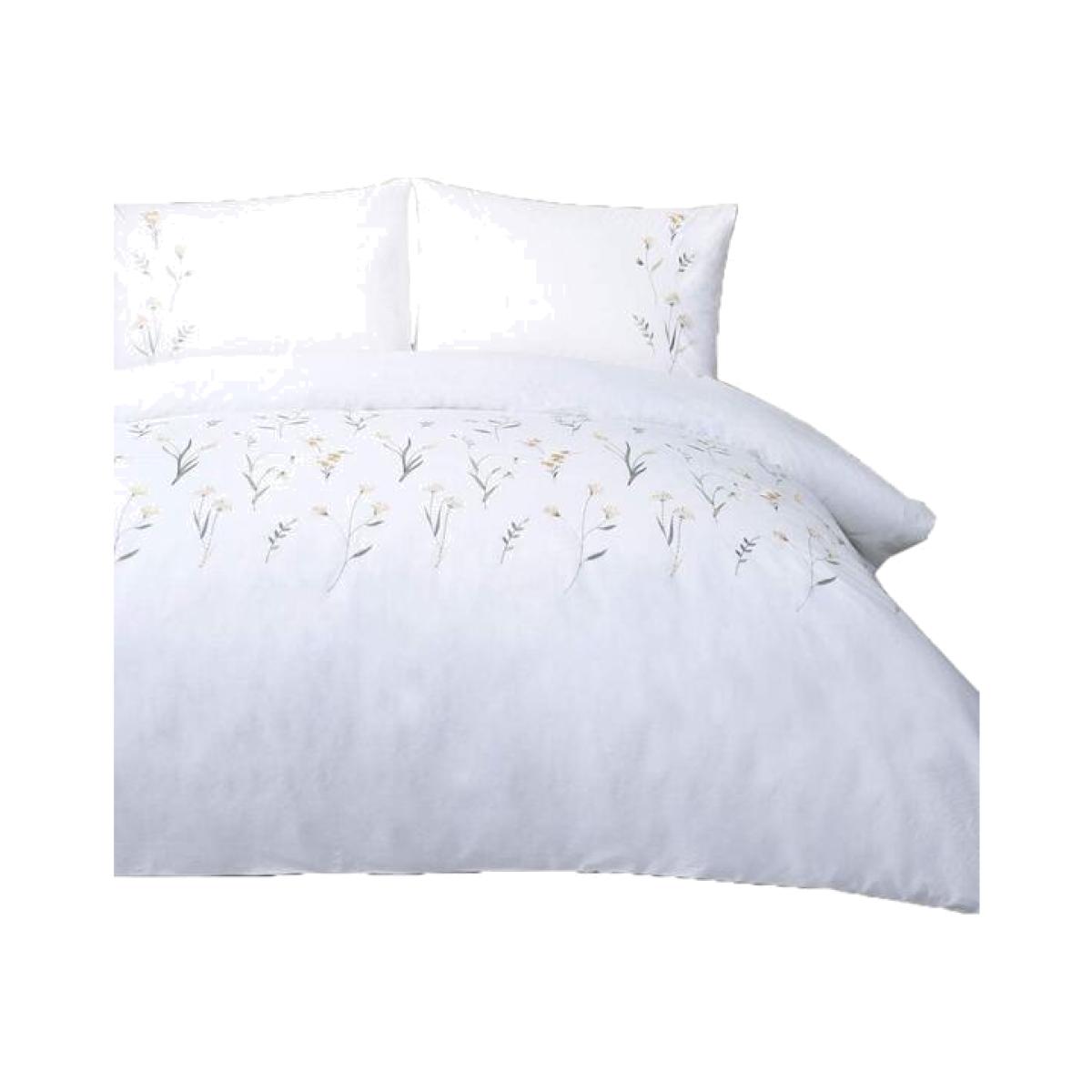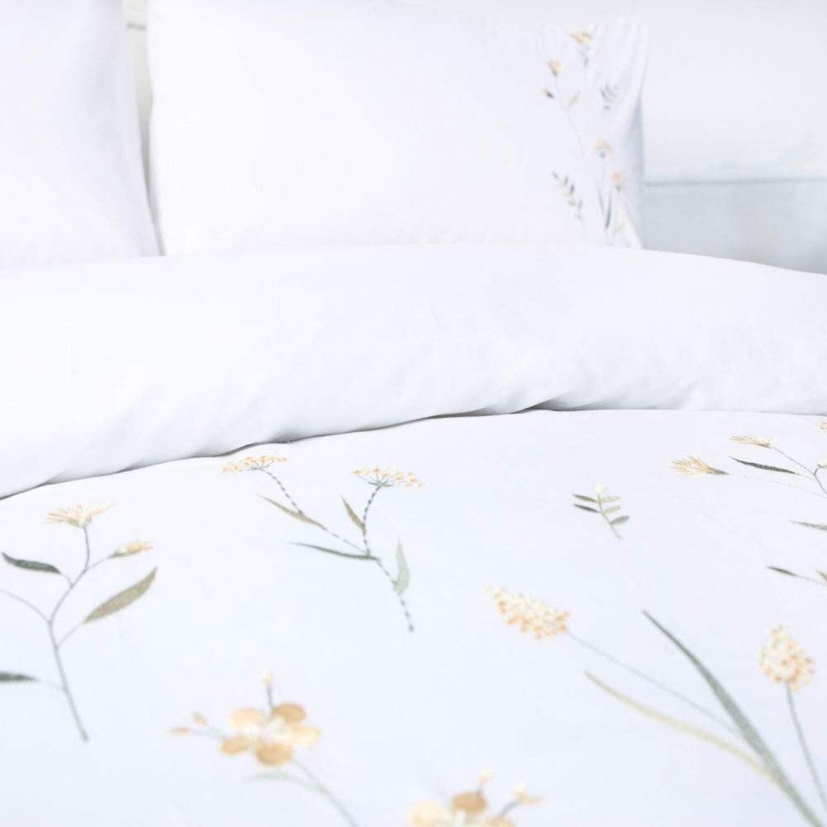 Material 100 Cotton. 1 Duvet Cover and 2 Housewife Pillowcases. Featuring buttercups, hyacinths, snowdrops and dandelions, making Imogen a modern, stylish and pretty collection.