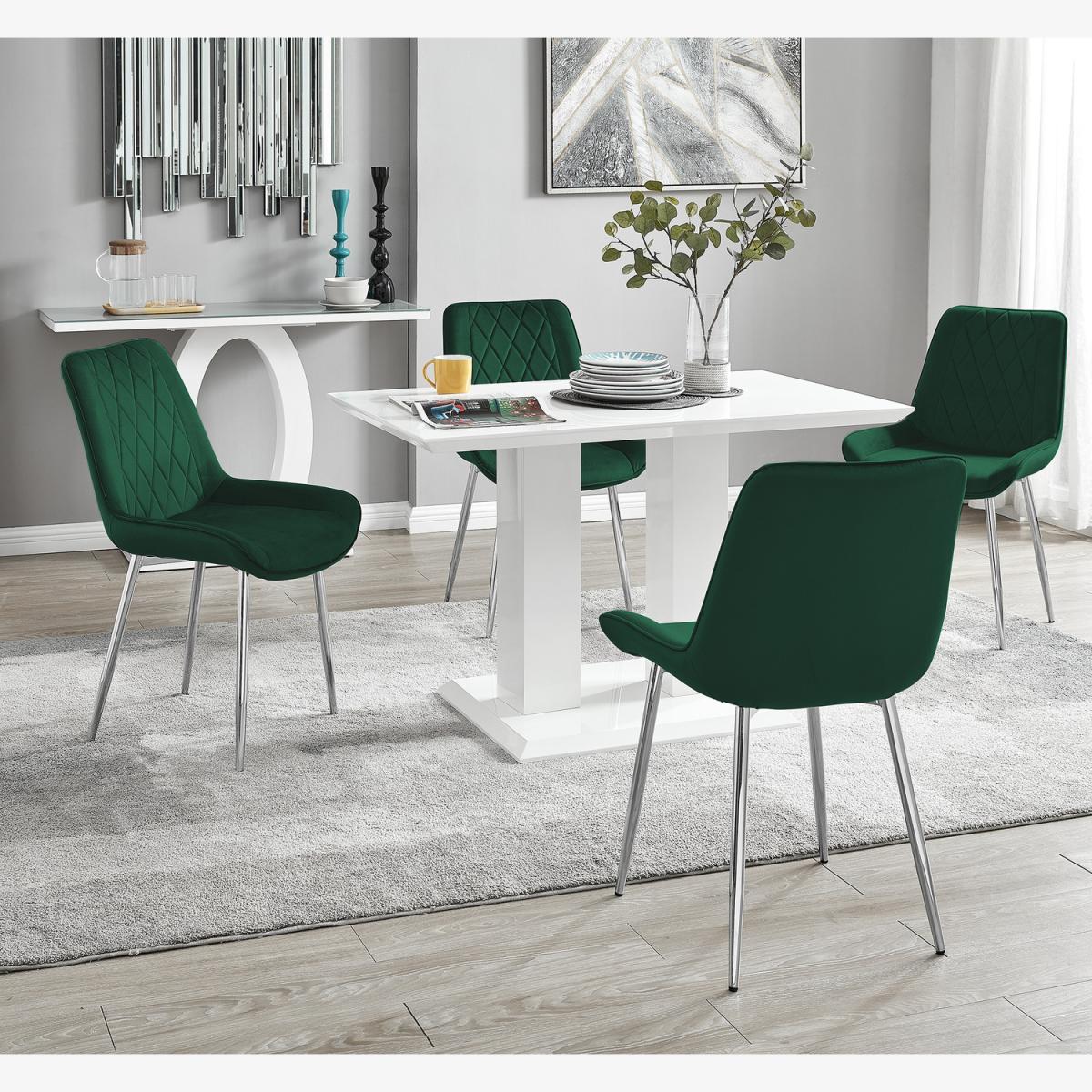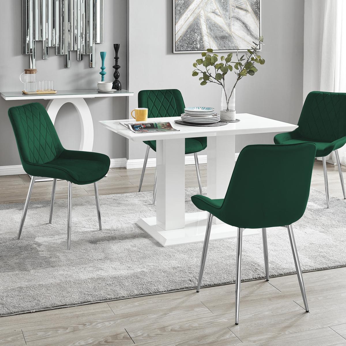 The grand Imperia table combines both style and quality at a price that cannot be beaten! The dining table boasts a large 120x70cm surface leaving plenty of room for dining with guests. Beautifully finished with a slick high gloss lacquer surface the table is a real stand out and would provide a modern look to any home! By seamlessly fitting into any dining area the Imperia table really is a must have. The high gloss finish also allows an easy to maintain and clean surface to keep the table looking brand new for years to come!Modernise your dining area with our luxurious velvet upholstered Pesaro Dining Chairs. With a nod to the Mid-century modern design era, the Pesaro features gorgeous textured diamond stitching with an ergonomically designed curved seat pad blending seamlessly to the supporting medium high back rest. Sat atop elegant slightly tapered legs in black, chrome or gold effect. The Pesaro is a perfect match to any dining table or use as a luxe vanity seat in the bedroom, as an occasional chair for the living area or to add a bit of luxury to your home office.
