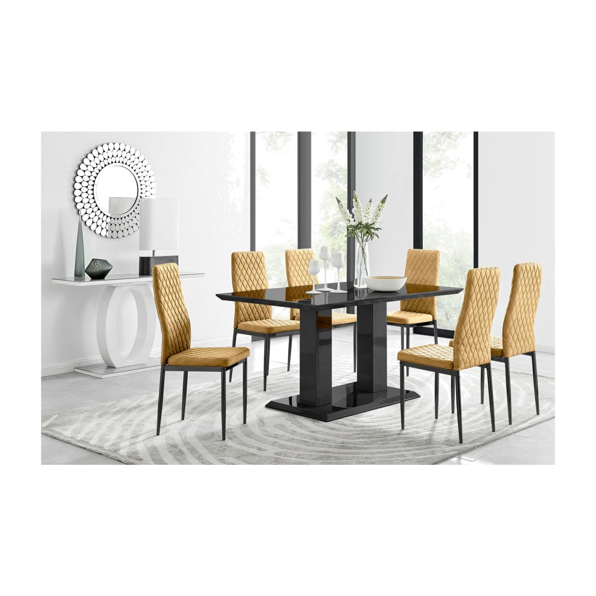 With its unique pillared structure and high gloss surface, the Imperia dining table has a modern but classically elegant design, for those looking for the perfect new addition to their home. Comfortably seating up to 6 guests with its generous 150 x 90 cm surface, the Imperia 6 dining table is perfect for larger families that want impeccable design on a grander scale. For those with smaller spaces, we also do the Imperia in a comfy 120 x 70 cm size, seating up to four guests. Upholstered in soft touch mustard yellow velvet and finished with diamond pattern stitching the Milan dining chairs would seamlessly fit in with most dining spaces, whilst not compromising on either style or comfort. The stylish black powder coated metal leg and hatched velvet combination gives this chair a contemporary edge, whilst it's simple design allows for practical everyday usage. The chairs are made from high quality durable velvet that's easy to keep clean and are ergonomically designed for maximum comfort and support. They feature a deep foam seat cushion and plastic feet to protect the floor from any damage! At an unbeatable price you cannot go wrong with these chairs!