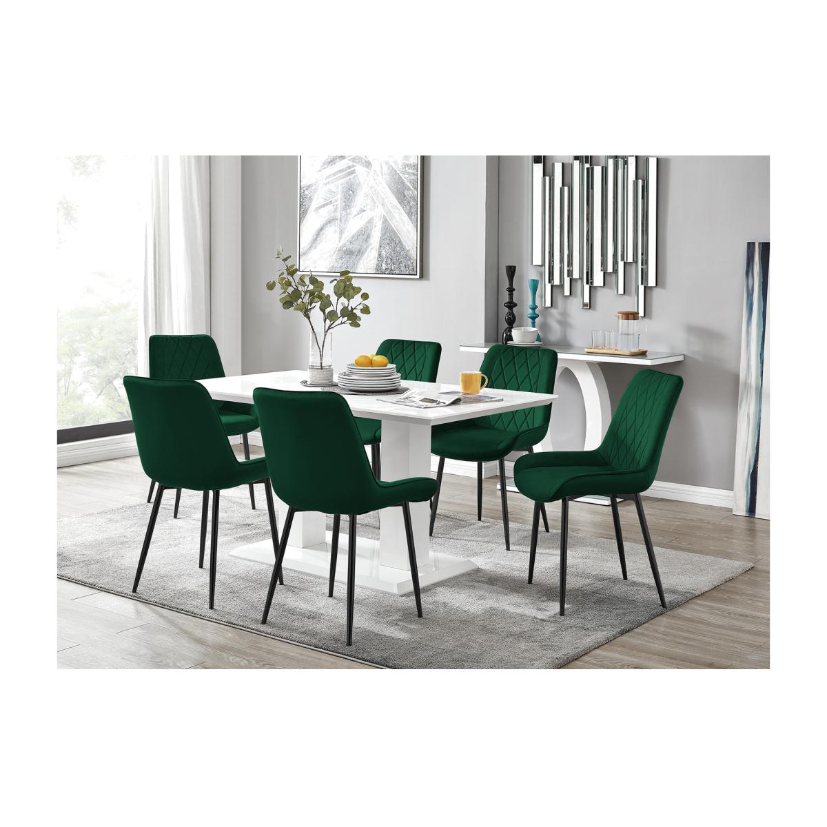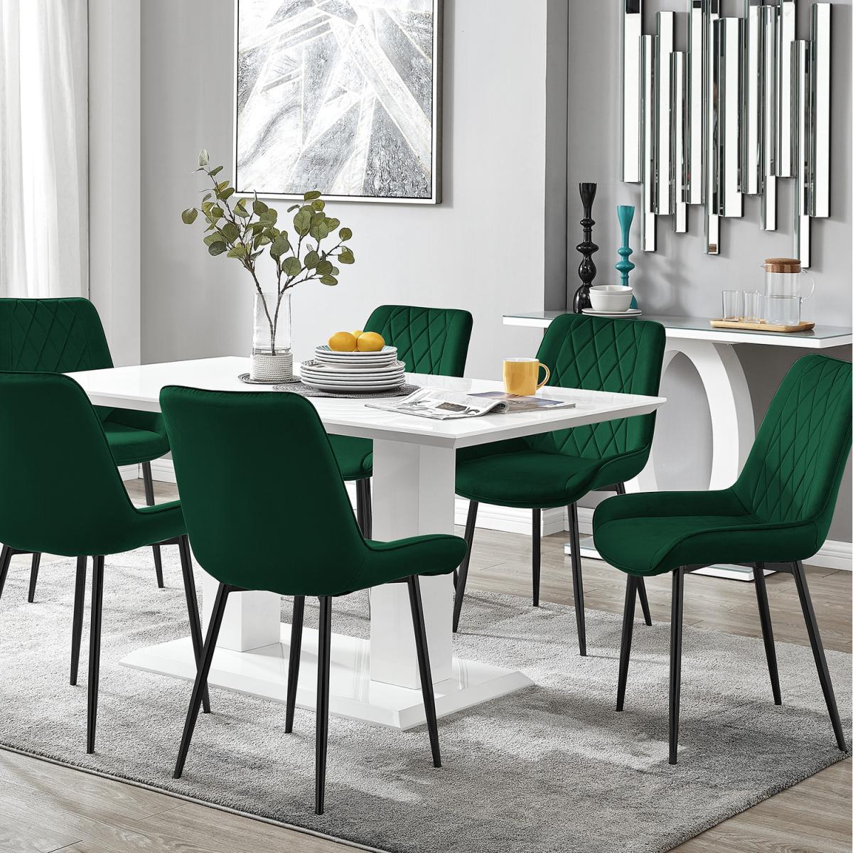 The grand Imperia table combines both style and quality at a price that cannot be beaten! The dining table boasts a large 150x90cm surface leaving plenty of room for dining with guests. Beautifully finished with a slick high gloss lacquer surface the table is a real stand out and would provide a modern look to any home! Seamlessly fitting into any dining area the Imperia table really is a must have! The high gloss finish also allows an easy to maintain and clean surface to keep the table looking brand new for years to come!Modernise your dining area with our luxurious velvet upholstered Pesaro Dining Chairs. With a nod to the Mid-century modern design era, the Pesaro features gorgeous textured diamond stitching with an ergonomically designed curved seat pad blending seamlessly to the supporting medium high back rest. Sat atop elegant slightly tapered legs in black, chrome or gold effect. The Pesaro is a perfect match to any dining table or use as a luxe vanity seat in the bedroom, as an occasional chair for the living area or to add a bit of luxury to your home office.