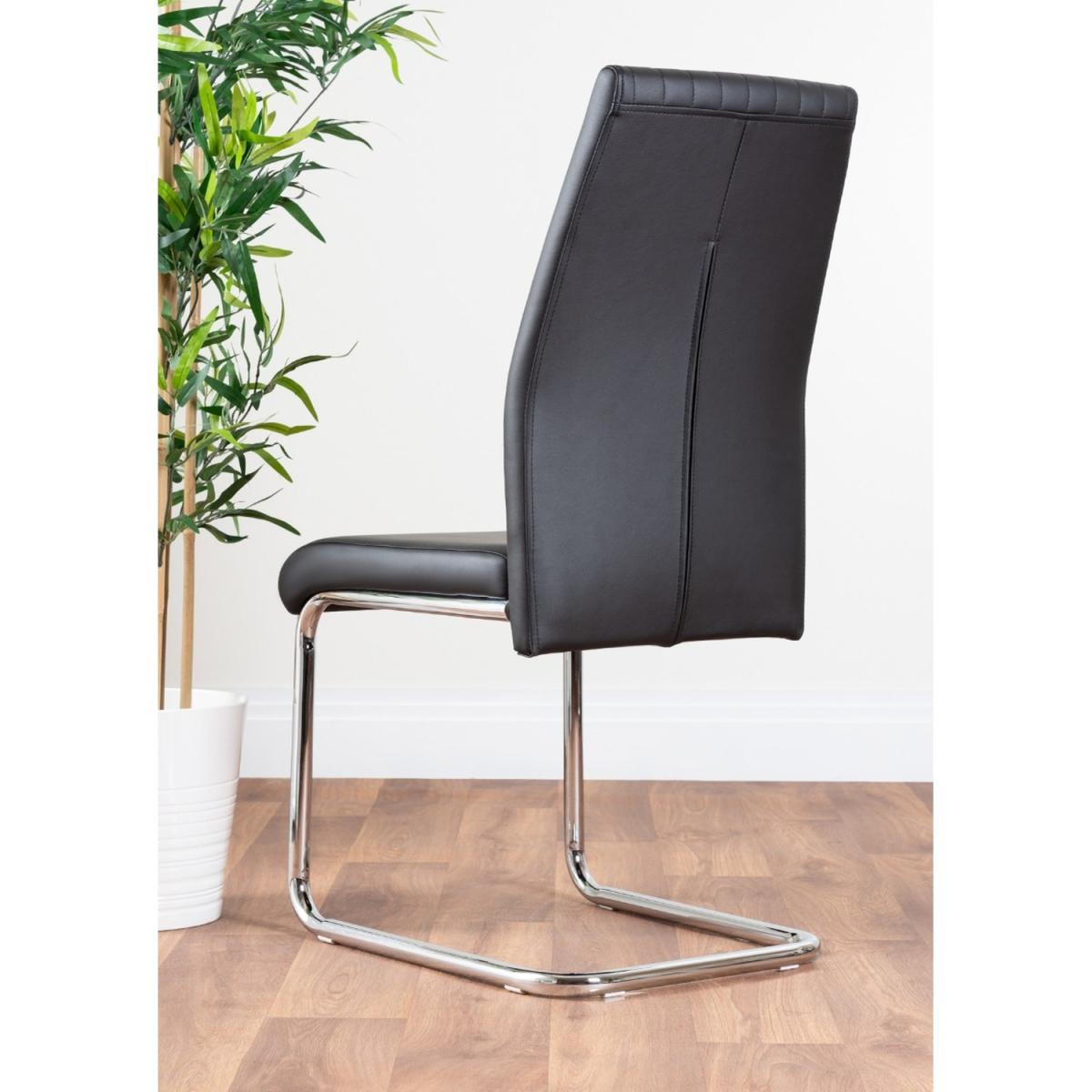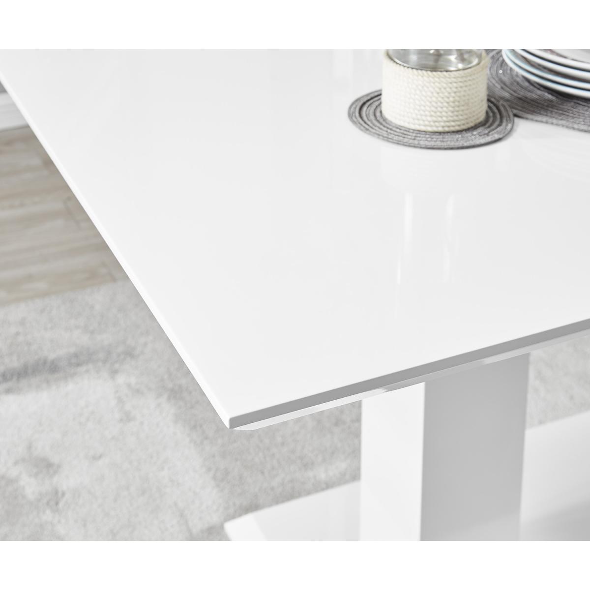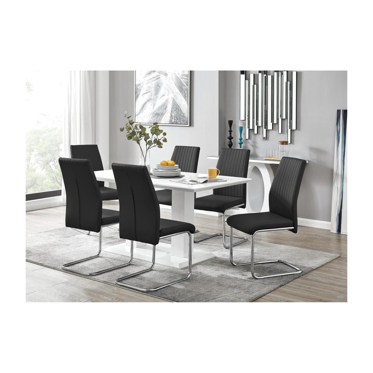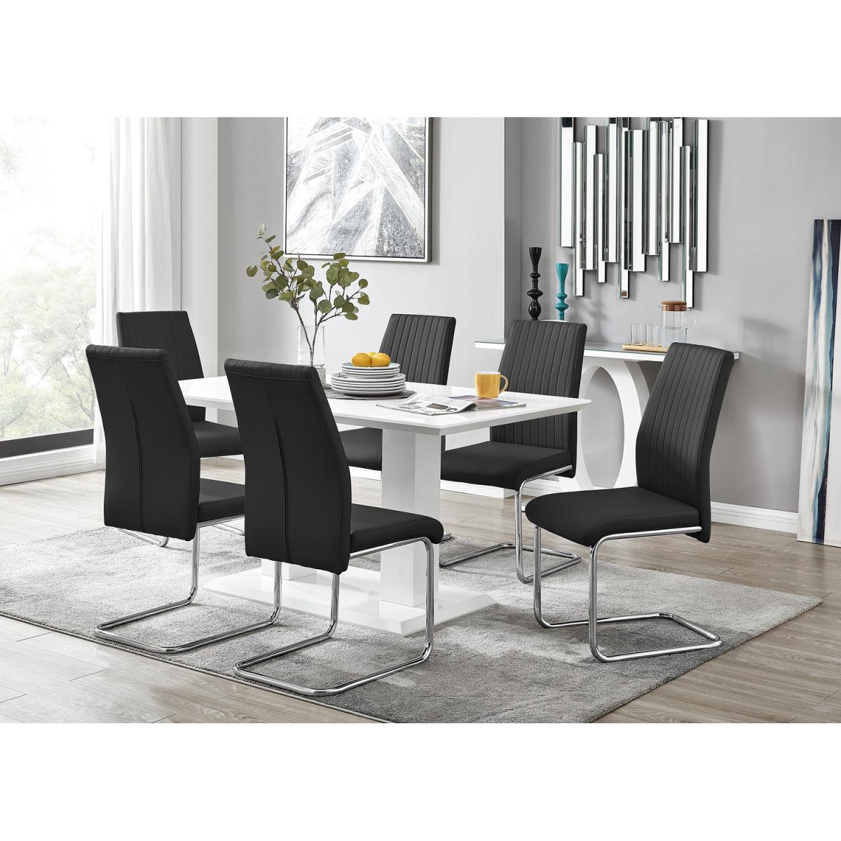 Add a touch of class to your dining room with this beautiful Imperia dining set. The set combines both style and quality at a price that simply cannot be beaten! The dining table boasts a large 150x90cm surface leaving plenty of room for guests and has a slick high gloss lacquer finish making it a stand out addition to any home! Matched with a set of six stylish Lorenzo chairs this set will be sure to modernise your home. The stylish curved chrome leg and stitched leather combination gives this chair a contemporary edge, whilst it's simple design allows for practical everyday usage. The chairs are made from high quality faux leather and are ergonomically designed for maximum comfort and support. The soft touch faux leather with a deep foam seat cushion mean they are a delight to sit on and the plastic feet protect the floor from any damage!
