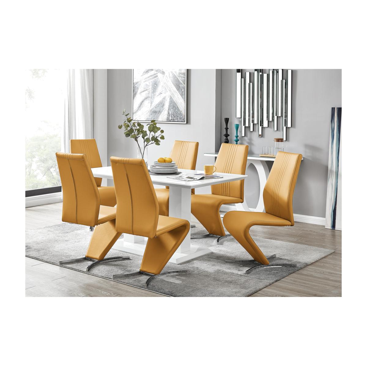 With its beautiful Grecian style pillared frame, the Imperia 6 dining table will enrich your dining room and be the envy of your dinner guests. Featuring a 150x90cm high gloss surface finish, the table is not only a dream to wipe down after those messy dinner parties and family meals, but is also truly stunning when exposed in light. This unique table design boasts style and affordability. Paired with our eye catching Willow chairs, with their luxurious curved frame and half crescent chrome feet, this set is sure to make any space a talking point for years to come.